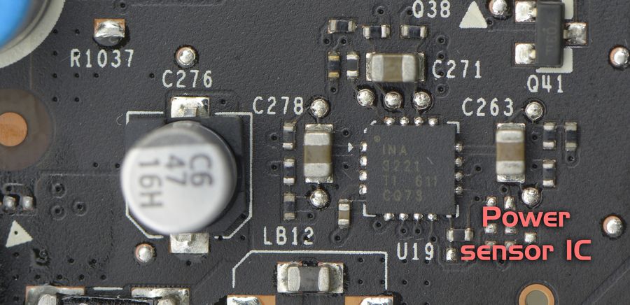 На карте распаян контролёр,который является трехканальным монитором, способным измерять напряжение, ток и мощность на входных линиях +12, рядом с ним три конденсатора,картинка от 1080 на 1080ти примерно также: