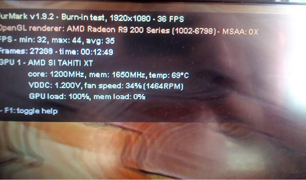 после 12 минут фурмарка ,дальше влом тестить было так как температура не росла , на частотах 1100 мгц по гпу и 1650 по памяти , всего 67 градусов при скорости вентиляторов 1338 RPM(31%)