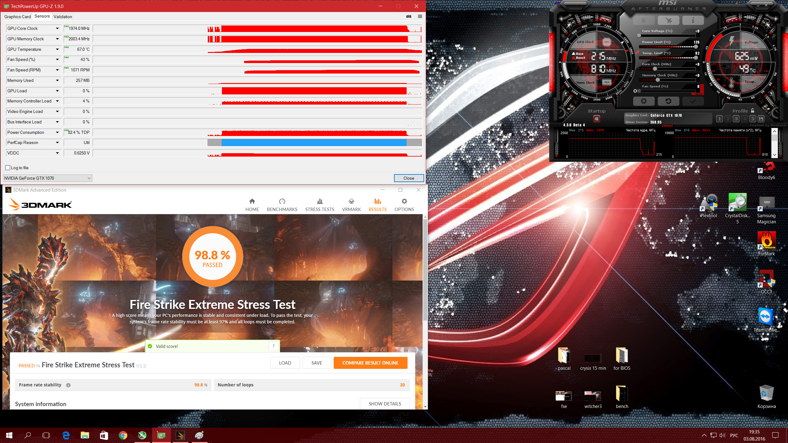 Jordan, вот прогнал gtx1070 в стресстесте fse. Всё в стоке, подняты лишь лимиты. В корпусе одна вертушка сзади дует на радиатор, обдувает немного бэкплейт ВК.
