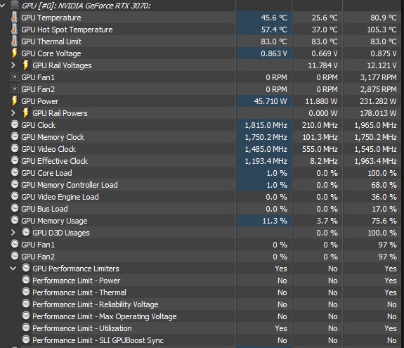 новый сюрприз подкинула 3070 asus tuf - андервольт 0,875/1950. Скачал atomic heart, играю час, все как обычно температура 60-62, потребление 170-180w. За пару секунд температура улетает за 80, потребление 240, карта по hwinfo уперлась в pl и tl при напряжении 0,875. Что происходит?