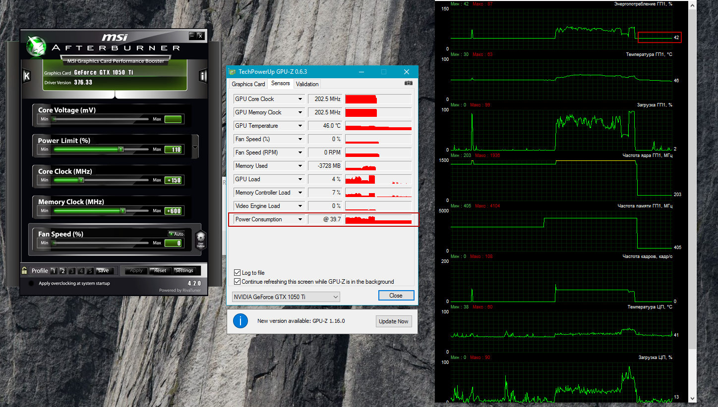 Подскажите по вопросу энергопотребеления данной карточки. Когда-то прочитал обзор https://www.techpowerup.com/reviews/MSI ... _X/25.html Был удивлен низким энергопотреблением. Но тут купил msi 1050 ti и как-то неприятно был удивлен, ни о каких 3 вт в простое и речи не идет. Карта в простое потребляет 42 вата, скрин приложил