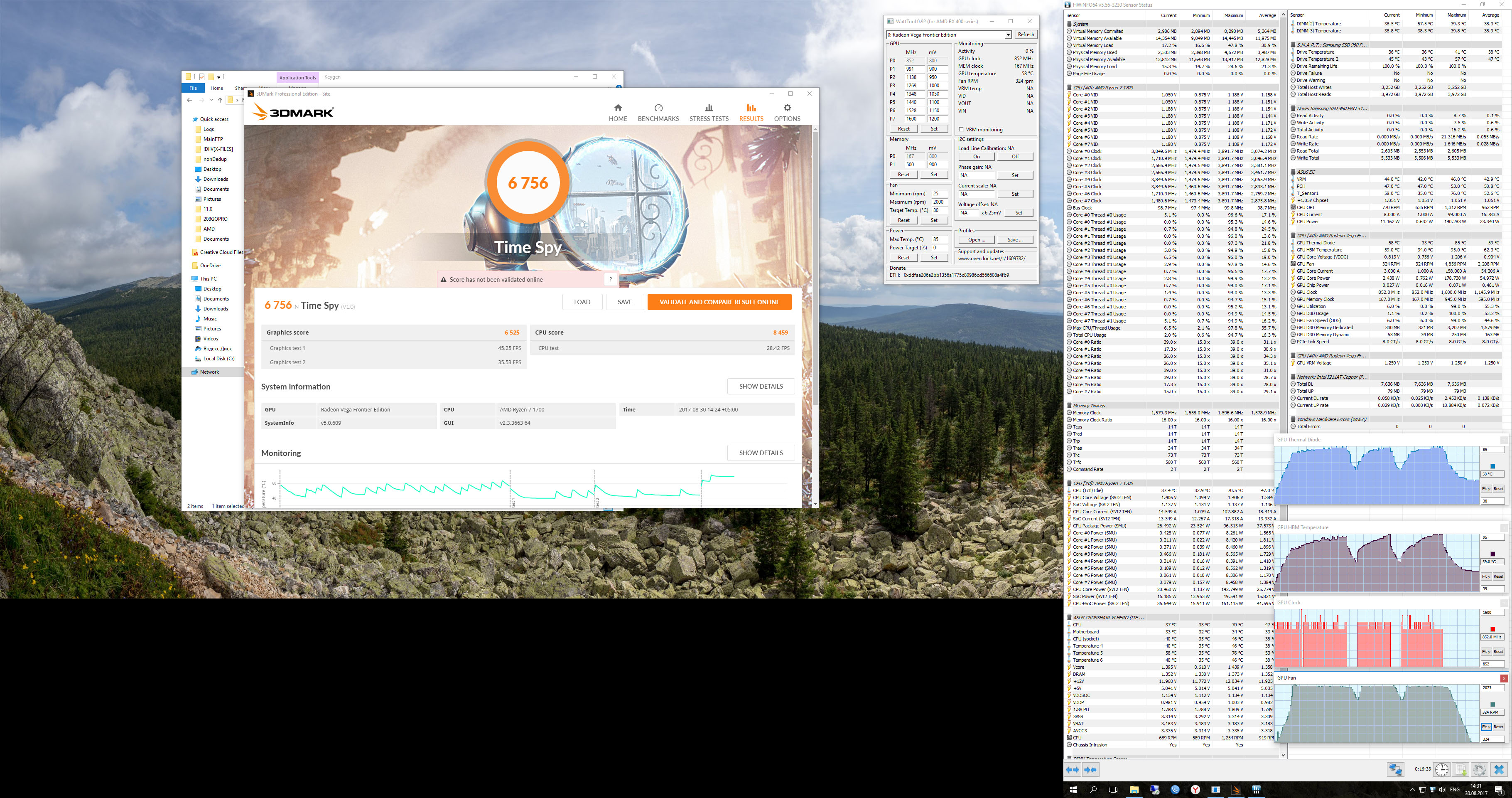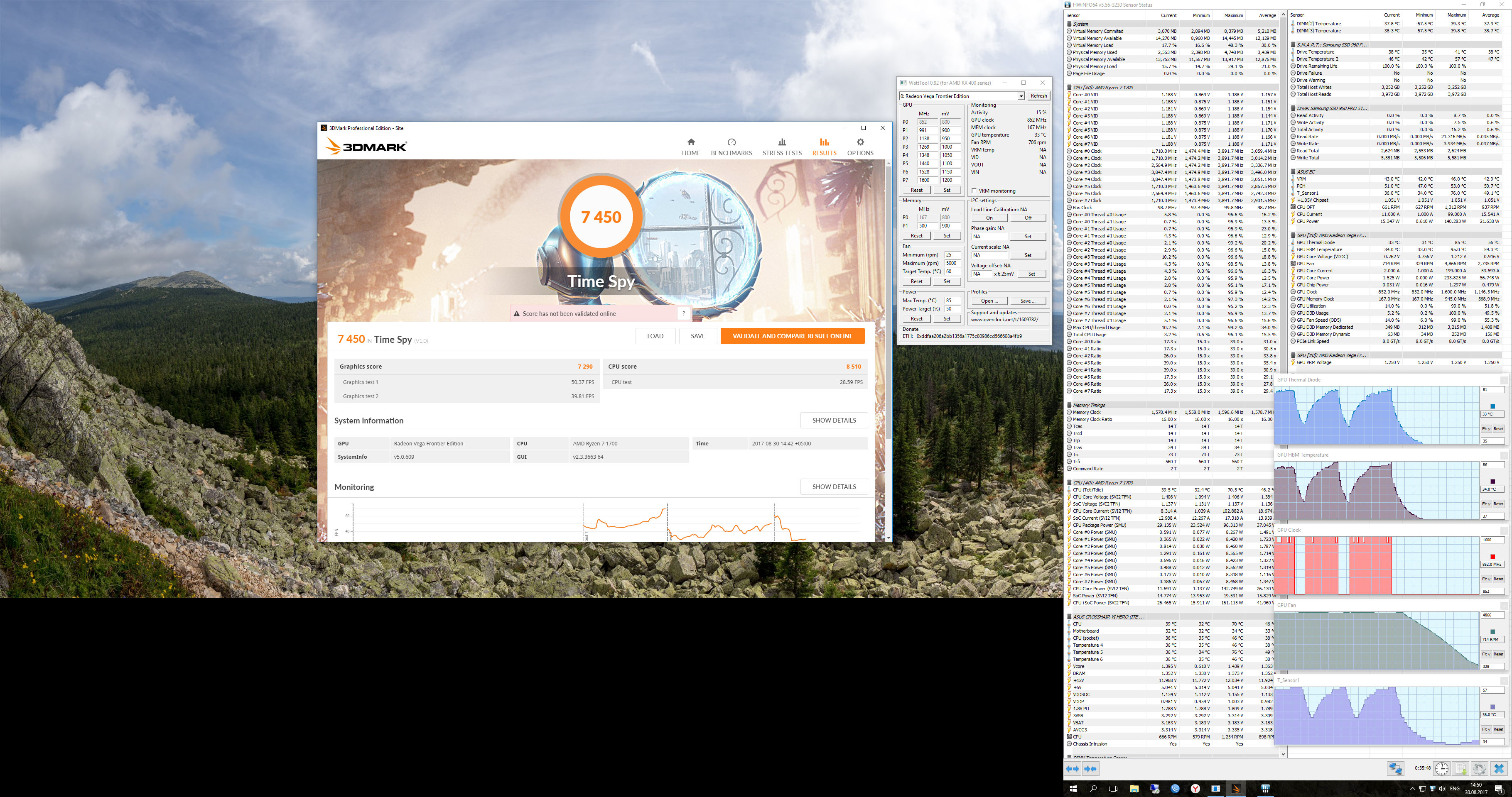 IceDragon, BOL Немного тестил FE, может игровая отличается, но судя по обзорам не сильно. Вообщем суть в чём. В любой задаче или игре, как я ранее писал, карта выше 2000 об/мин не набирает, температуры устаканиваются в районе 85/95 (ГПУ/ШБМ) и частота около 1440 МГц трепыхается. Пробовал устанавливать поверлимит +50% и максимальные обороты 5000. В таком случае ГПУ стабильно держит 1600 МГц, память поднимал с 945 до 1050, но приросту в Ghost Recon Wildlands (плохой пример, игра совсем "зелёная") это особо не дало, судя по фпс (было 40, стало на 3-5 больше), хотя визуально чуть-чуть глаже, однако, это субъективно. Мне кажется, производитель уже выжал из неё всё, что смог. Предел 2000 об/мин на штатной турбине + "троттлинг" - золотая середина. И тихо, и быстро. Исходя из наблюдений, я просто не уверен в том, что разгон в 150-200 МГц даст существенной разницы. Нужен радикальный способ поднять частоты. Хотя бы до 1900 и выше.