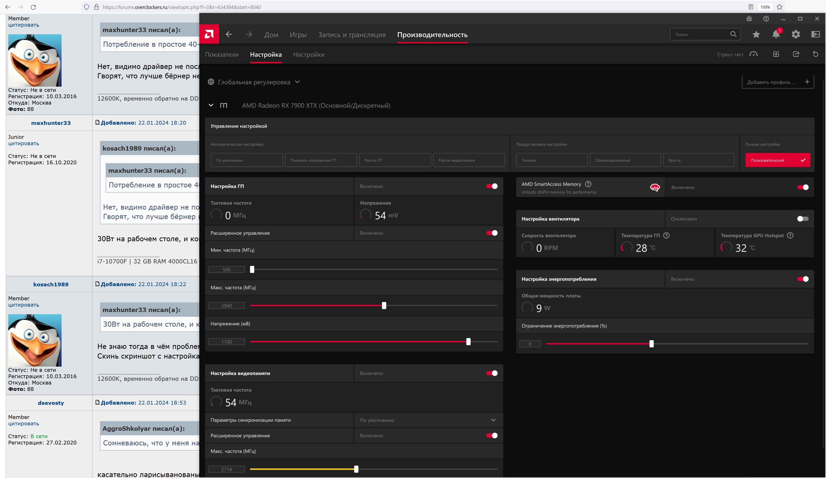 Привет!) Перешёл в лагерь красных,взяв rx 7900 xt nitro+ vapor-x. Кто подскажет, какой прогой андервольтить карту? Msi afterburner нужен для этого или в адреналине все делается? (ну как на нвидиа, понижение мВ на стоковых частотах и т.п) Потребление в простое 40-50Вт с фрисинк и 90Вт без так и должно быть? И для вывода показателей (фпс,частоты,напряжение и тд) все тот же Msi Afterburner подходит?