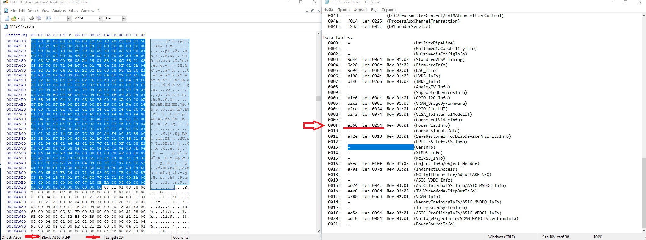 А я разобрался У моей Sapphire HD6930 вышли из строя вентиляторы и чтобы не городить колхоз, были заказаны новые с Али с той же маркировкой Firstd FD7010H12S. Вентиляторы прибыли, были установлены, всё подошло отлично. Первый запуск и… дёрнулись и не крутятся. Хорошо… Через AfterBurner меняю % оборотов. Стартуют где-то с 38% и развивают при этом 370rpm. На 100% около 4200rpm. Ну думаю надо в Bios правки внести да и всё. Нашёл обзор такой же видеокарты, с таким же охлаждением, всё один в один, только HD6950. Там видно, что на 100% около 4100rpm, на 23% около 1400rpm. Т.е. максималка практически как у оригинала. Сливаю Bios в файл через Gpu-Z, запускаю RBE, меняю параметр “Duty cycle min (%)”. Стояло 22%, ставлю 43% (1000rpm), т.к. 1400rpm мне показались великоватыми для минимума. Прошиваю, перезагружаю. В системе ничего не поменялось, кулер на 25-30% работает, точнее не работает. А вот в режиме «без драйвера» кулер начал крутиться. Гуглил, встречал только такие же попытки что-то изменить, но все приходили к выводу, что либо RBE этого не умеет с подобным семейством видеокарт, либо кулером управляет драйвер и кроме как использовать программное управление, например, через AB, с этим ничего не поделать. Далее были долгие танцы с бубном, в надежде наковырять в Bios нужную настройку. Благо на улице не лето и рядом балкон, остудив видеокарту, удалось определить минимальные 21% оборотов. Искал я эти 21 в Bios в Hex-режиме и не находил. Далее с TechPowerUp скачал Bios от HIS HD6930, т.к. она единственная в базе из аналогов с той же памятью. Прошил. Стало минимум 28%. Хороший знак. Но найти отличия в Bios так и не получалось. Вспомнил, что есть VBE для редактирования Bios видеокарт HD7000 серии. Открыл в нем Bios от HD7870, вкладку графика настройки кулера. Отредактировал немного, сохранил и сравнил до и после в Hex. Оказалось, что формат записи % кулера выглядит как XX00, где XX это %. Т.е. умноженное на 100 число. Сразу перевожу 21% > 2100 > 834 > 3408 и 28% > 2800 > AF0 > F00A. Ищу и сразу же нахожу. Меняю в HIS’овском Bios F00A на 3408 (через RBE, чтобы CRC посчитана была), прошиваю, перезагружаюсь и вуаля, стало как на Bios от Sapphire 21% минимум. Осталось перевести нужные 43% в Hex (CC10), прописать и зашить. Стало просто супер, в простое 40°/45%/1200rpm, при 63° в обзоре 2600rpm, у меня 2000rpm. В FurMark 77°/82%/3600rpm. Думаю это актуально на всех видеокартах HD5000 и HD6000 серии, жаль, что вовремя это не было внедрено в RBE. Надеюсь, пригодится кому-нибудь.