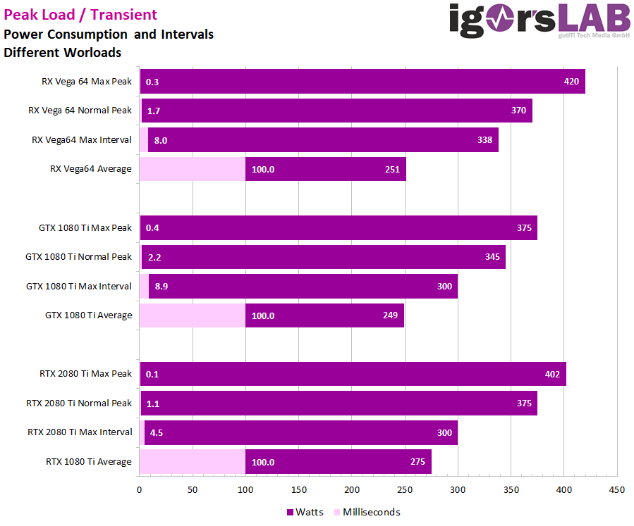 Чем больше ток, тем меньше надо для срабатывания защиты. Например выше на графики блок питание с Vega 64 выключиться от максимального тока (пика), а с 2080 Ti от длительной перегрузки 275 Вт против 251 Вт у Vega 64. Еще зависит насколько быстро сама видеокарта уменьшает ток