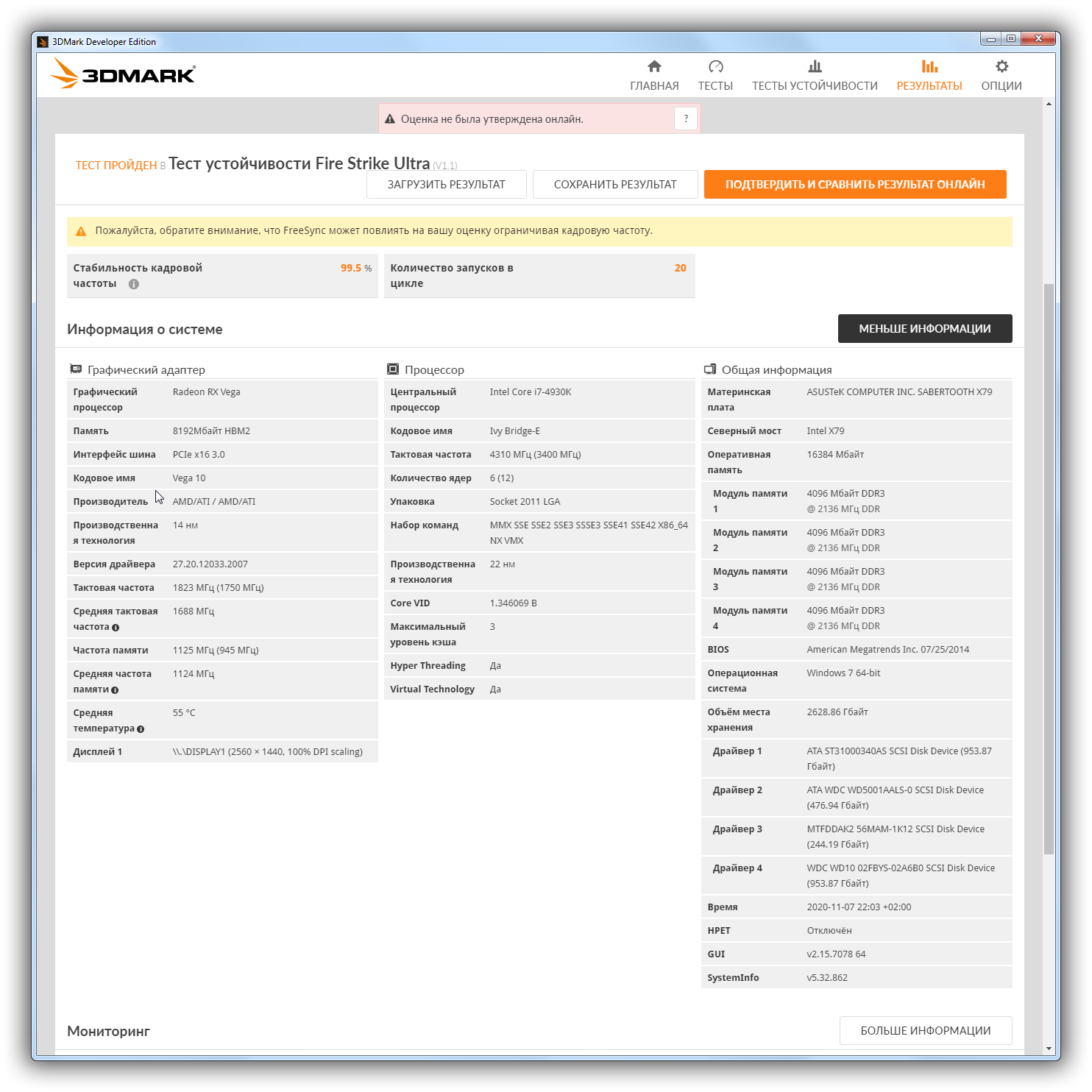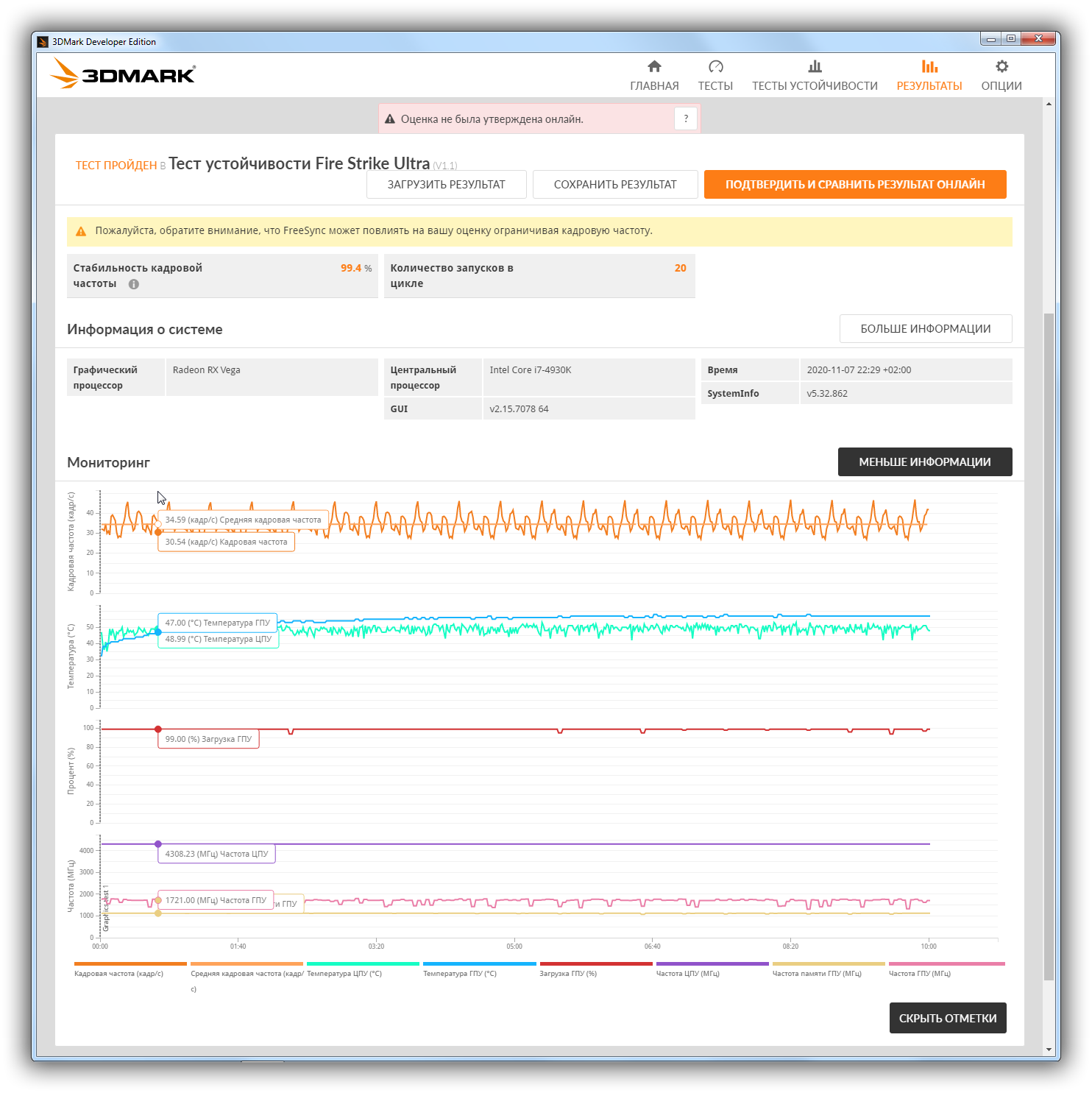 Вот прогоны смотри в 3DMark.Тест и прогоны 2 раза по 20 прогонов.