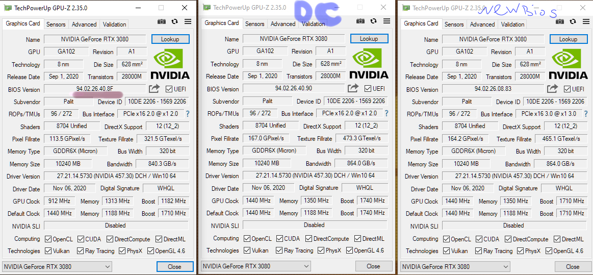 одна Palit RTX 3080 GamingPro обладает старым биусом;