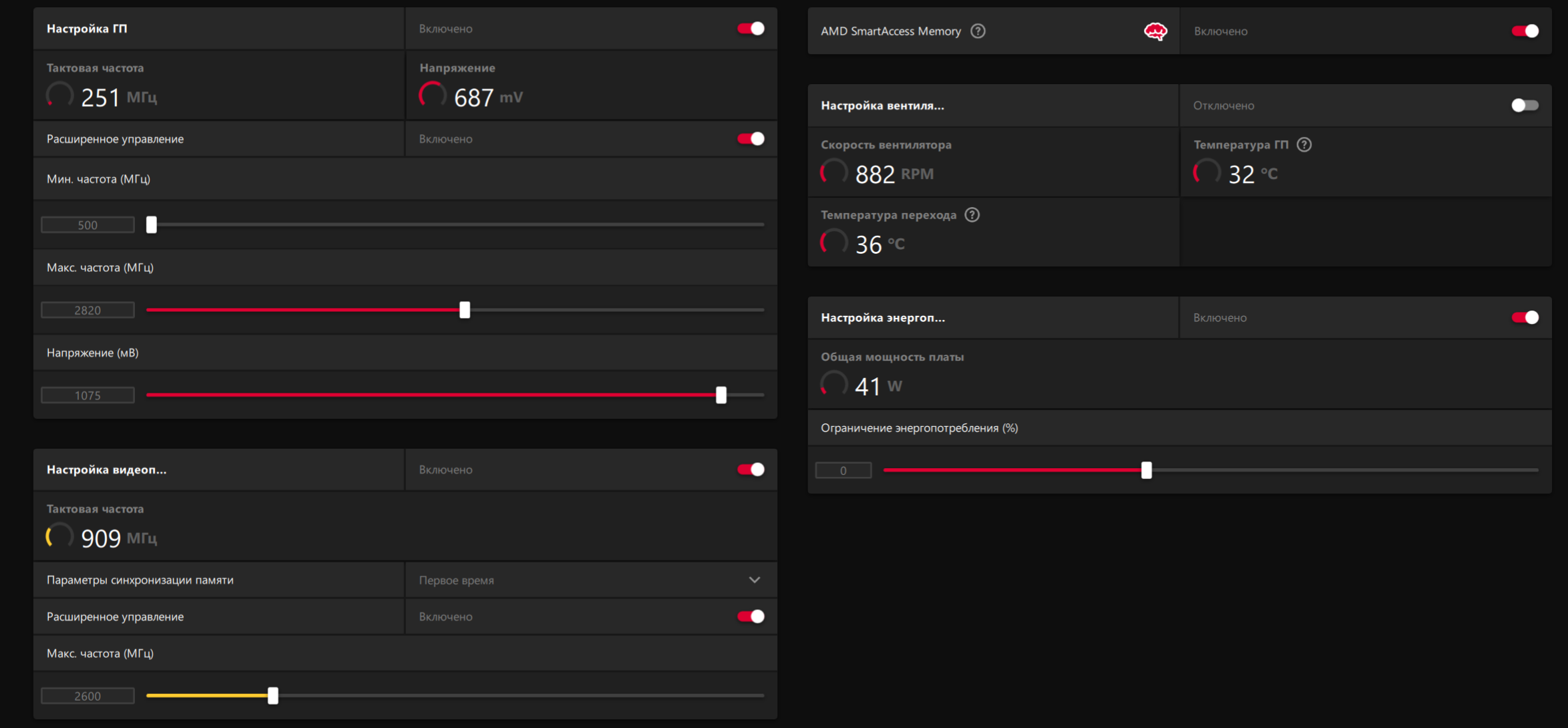 rx 7900 xt hellhound настройки андервольта на скриншоте. При попытке разгона гпу после частоты примерно 2850-2900 частота памяти падает резко с 2600 до 2000-2100, и в итоге теряешь производительность, это какая то особенность (как в процах контролер памяти скидывает 1к1 если не тянет?) или я что-то делаю не так? разгоняю через софт от амд напряжение пл и вертушки в макс память 2600.