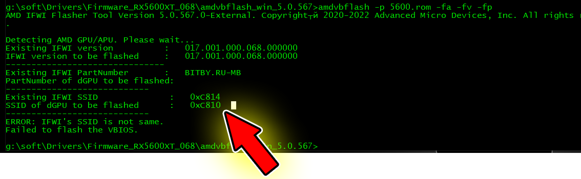 Видеокарта RX 5600 XT. BIOS беру от TechPowerUp (официальные от AMD не смог найти). Такой же версии как и установленная. Но вот SSID, там другого "0x0c814" нет. И при использовании всех нужных ключей, всё равно выдаёт ошибку подсистемы по идентификатору - IFWI SSID. Ответ нашёл лишь на китайском форму, но там ветка заглохла без решения. Дополнение: Сейчас стоит вот эта прошивка: https://www.techpowerup.com/vgabios/253161/253161 И слишком ли она отлична от https://www.techpowerup.com/vgabios/219 ... 144-200309 В установленной урезана сильно tCL с 32 до 24. Что это за параметр и за что он отвечает, не разобрался.