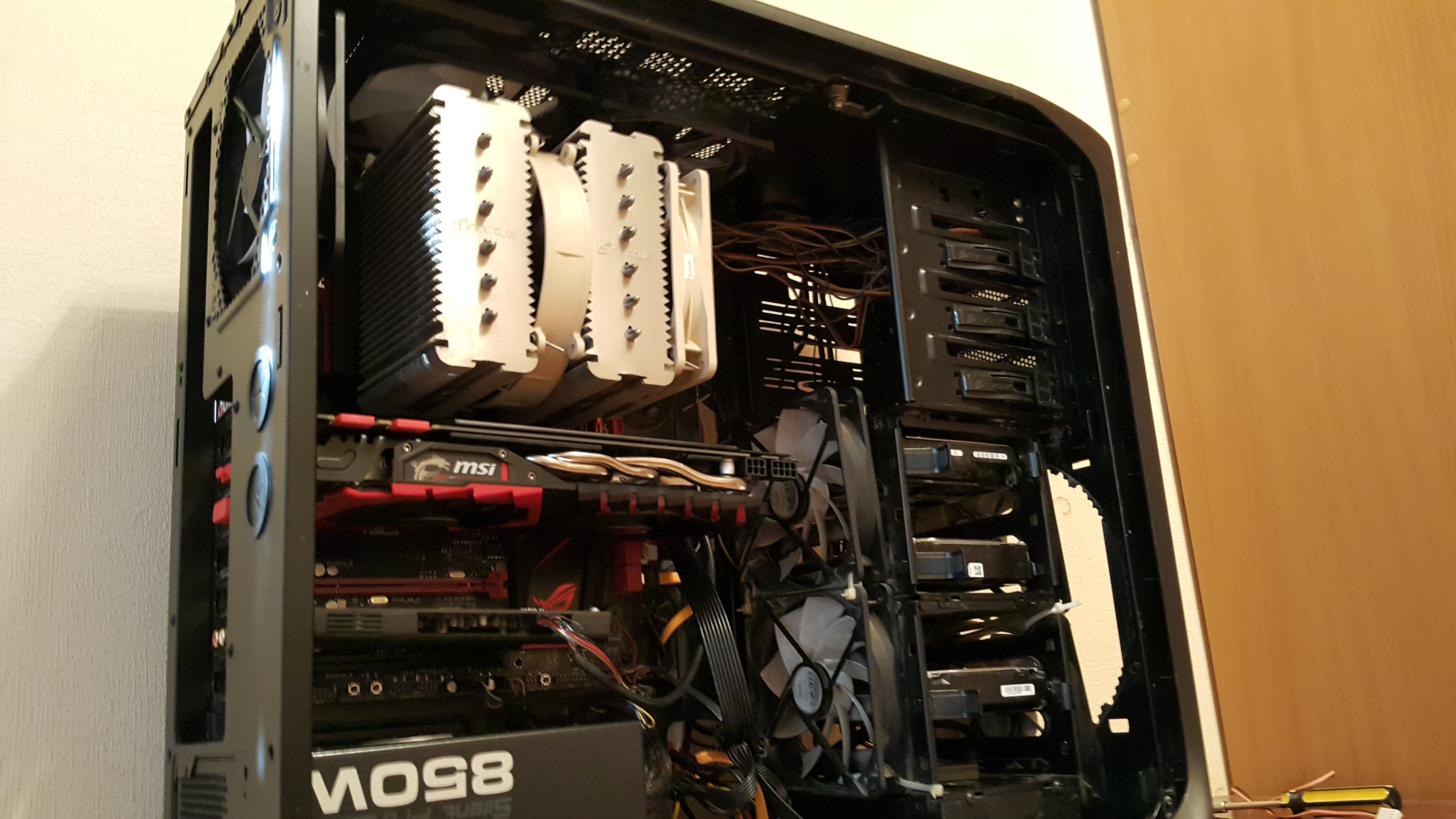просто вентиляторы должны быть от 90мм, 80ки и ниже просто не могут тихо создавать поток, чтобы создать хоть какоето давление им нужно крутится от 2200 до 3000об а это очень громко, были у меня твин фрозы 3, в кроссе при жосткой нагрузке могли раскрутить свои 80ки до 3000-3400 об. это реально пила (громче их я еще не слышал), а толку нет. ротор занимает место как и в больших вертушках и лопостя из-за этого имеют меньшую площать и на много, получаем меньше поток, но больший шум из-за оборотов. в таких случаях я делал так: ставишь две 92мм и получаешь бесшумную систему и в разы ниже температуры. лучше даже 120ки влепить, но их крепить гемор. говорю как бывший копатель биткоинов))