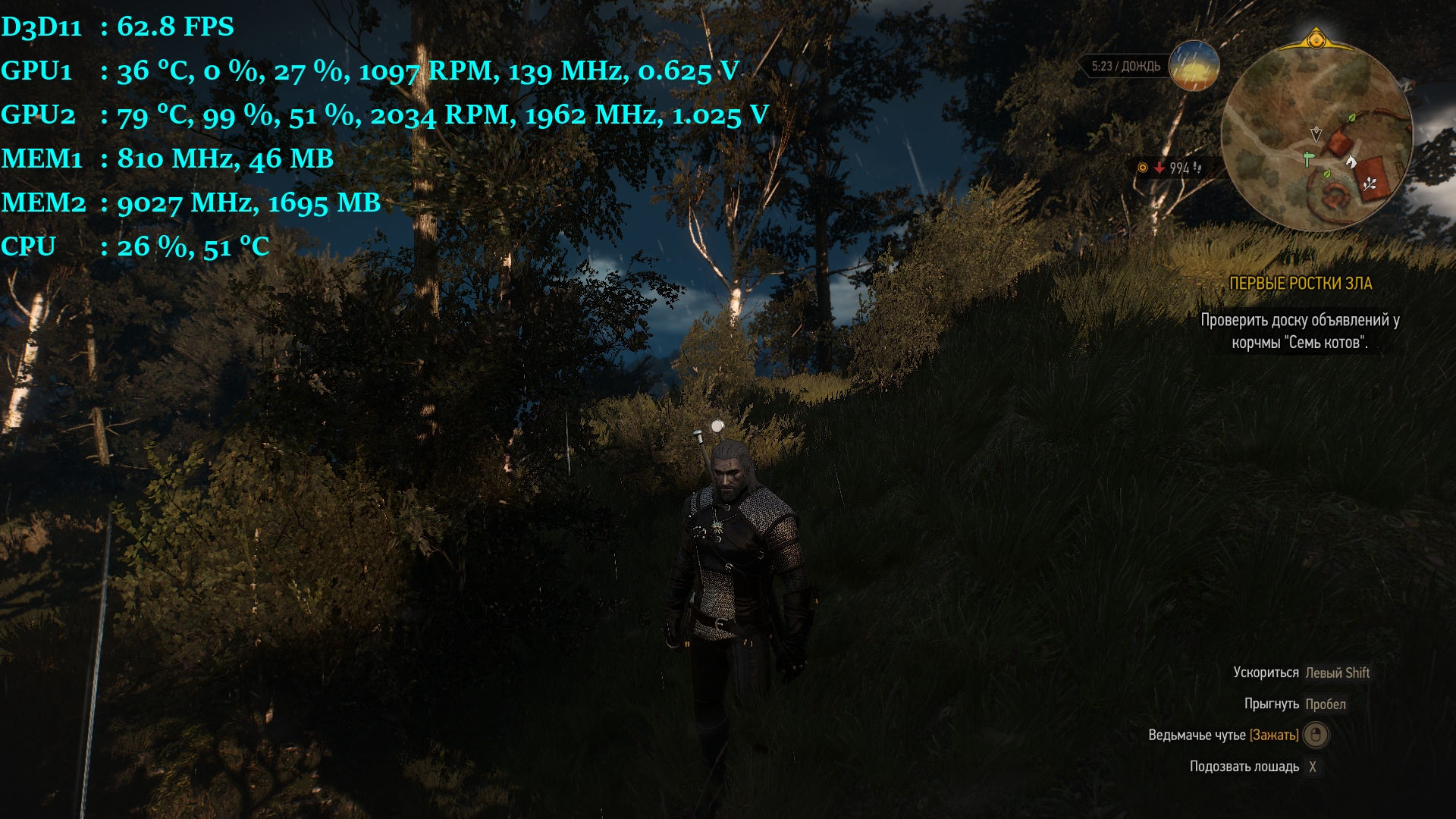 В том месте на одной 45-55 фпс ,жесткое там место, да я в дождь попал с ветром и ночью,там пока для тестов и остановился.А не вру я писал то в Фуллхд ,а на одной бегал в 1440р