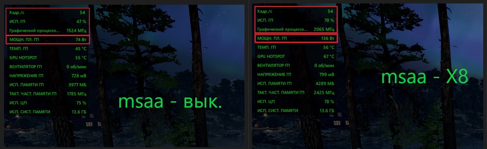 Благодарю.... но что происходит в этой игре понять не могу... вот скрин, Все настройки идентичны кроме мсаа. Странно что при изменении этого параметра на х8 немного увеличивается потребление, частота гп, загрузка гп... (хотя остается еще много запаса) и при весем при этом фпс стоит как вкопанный хотя по идее это самая ресурсо-емкая настройка.... что же его может так держать.... просто хочу разобраться....