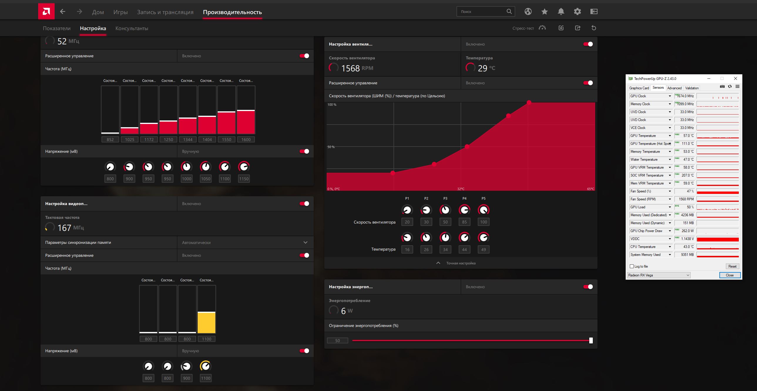 brenic, мой бп thermaltake tr2 rx trx-1200m , от него 1 8 пиновый провод идёт в вк, второй провод из PCI-E connector , так как два оттуда это выкл компьютера.. видимо там нет полноценных 12 вольт, я не знаю.. На бп ничего не подписано так же как и на кабелях.. Остановился на настройках 1668 в бусте 1730, пока полёт нормальный.. А скажите, вот датчик Soc который в в GPU Z , в программе Hwinfo он же GPU VR VDDC Temperature? Просто если это он, то там выше 57 что на памяти что на чипе не поднимается..