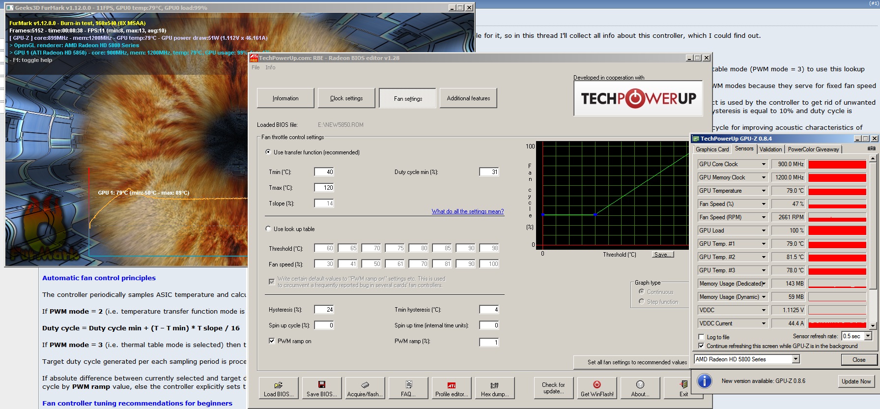 Вроде что-то поменялось, хз. В общем, оно до 90 градусов доходит и врубает с 26% оборотов до 47% (а раньше лениво до 33% ползло, потом подскакивало до 37%, но этого мало, т.к. чип грелся до 90 градусов временами). Это я без дров чисто на RBE нашару график поднял. При 900/1200@1,125в в таком режиме после 90 градусов опускается до 80. Когда уже нагрузки нет, карта остыла, то на 66 градусах обороты с 46% падают до 27%. Контроль вентилем в прошивке как будто работает, но отчасти. На рефе 45-50% это предел по шуму. Дальше уже издевательство. Буду считать, что разобрался. Осталось частоты загнать, а то при запуске стоковые 725/1000 почему-то. Пока каталистом меняю.