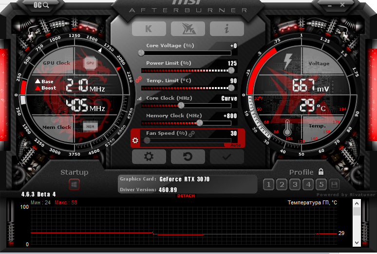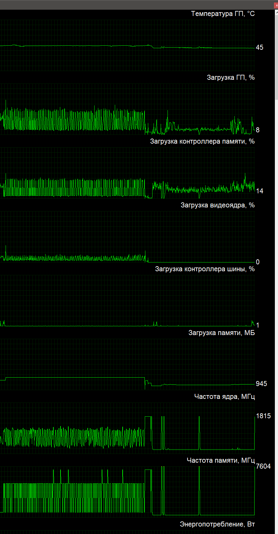 А ещё довольно странный режим работы карты в дефолте (часть графиков слева) - частоты и ядра и памяти слишком сильно скачут при моей загрузке (игрушка и фильм), вместо того, чтобы быть на какой-то средней величине. Мне кажется, но на старой GTX1080 так не было. Когда эта чехарда закончилась - это произошёл чёрный экран. После этого я закрыл зависшую игрушку и вернул разгон.