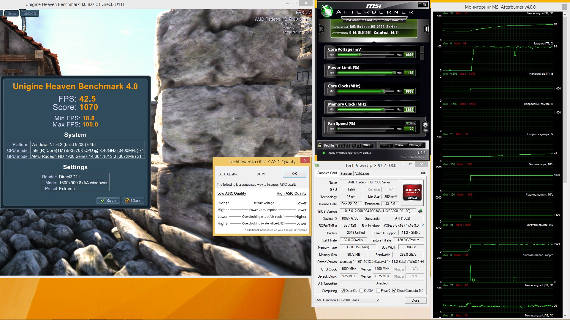 Решил снова вернуться на 7970 после полугода блужданий) Прикупил с рук Powercolor AX7970 3GBD5-M2DHG за 5500. Немного поиграл с разгоном, и пока решил оставил так: