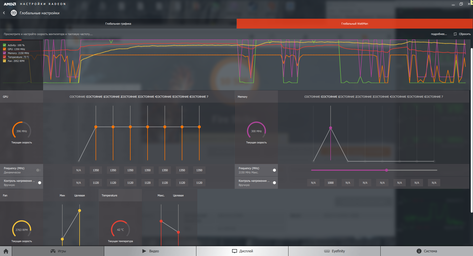 В итоге частота 1340 держится весь тест. Но не устраивает шум. Где в ватмане и с каким шагом уменьшить вольтаж? Энергоэффективность должна быть вкл. или выкл.? (сейчас выкл)
