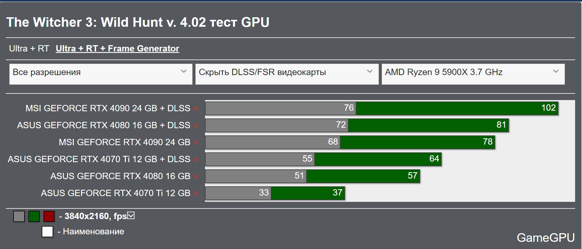 Здравствуйте, ни где не нашел ни одного сообщения на мою тему, поэтому пишу тут. У меня происходят странные вещи с производительностью rtx 4090. В игре Hogwarts legacy на настройках ultra видеокарта выдает 55-70 кадров в секунду, включение dlls никак не влияет на производительность. С включенными dlls у меня тоже 55-70 фпс. Но энергопотребление падает до 225 ватт, хотя без dlls потребляемая мощность 310 ватт. Генератор кадров тоже не влияет на производительность, при его включении фпс вообще ни как не меняется. В обновленном Ведьмак 3 генератор кадров работает хорошо, но без него при включении dlls фпс так же ни как не меняется. Без dlls 55-60 кадров и с включенным столько же. Как такое может быть, что с включенным dlss такое же количество кадров, сколько и с выключенным? В Cyberpunk 2077 все работает нормально и dlls и генератор кадров. Подскажите пожалуйста, в чем может быть проблема? Все настройки максимальные в 1440p, с лучами. Использую Windows 10. По характеристикам: Ryzen 5900x 4.7ггц. Asus strix b550-e gaming Msi geforce gtx 4090 ventus 3x 24g oc HyperX fury 3800 cl 18, задержка 60ns Be quiet Dark power pro 11 80+ platinum 1000w Монитор VIEWSONIC XG2703-GS 2к 165гц (Все игры из стима, обновлены до последних версий), драйвер вк тоже стоит самый актуальный.