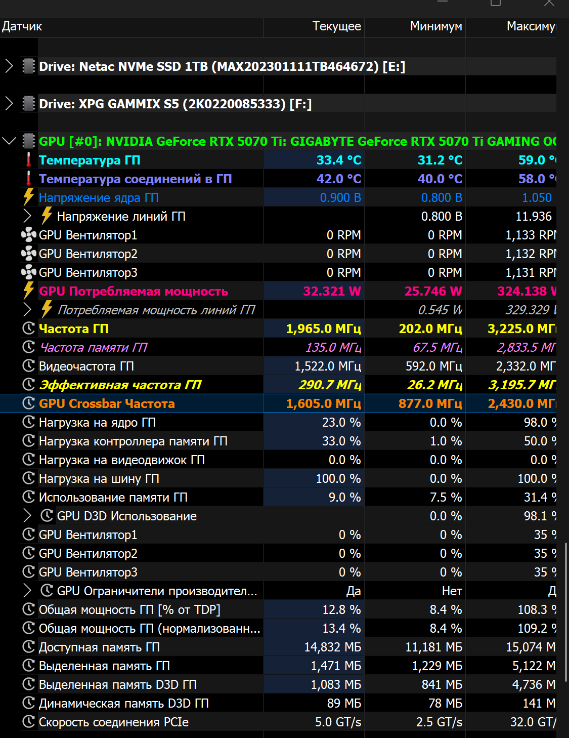 Возможно Что касается Crossbar, то что ты про него пишешь действительно актуально для 5000 серии. Я не знал, что это называется именно так и то, что мониторинг данной величины существует. Но чего в этом особенного для архитектуры видеокарт? Когда мучал карты (5070ti и 5080) разными биосами в бенчмарках, я заметил (и не только я, естественно), что при достижения определённой точки поднятия частоты производительность падает или стагнирует. То есть, как ты и писал - частота растёт, а производительность нет (кукуруза). Увеличение напруги и расширение поверлимита может дать возможность чуть дольше поднимать частоту. Курвой тоже долго игрался, но самым сбалансированным под мои хотелки, для моей 5080 оказался биос с напругой 1,065, лимитом 450 Вт и с частотами по GPU-Z как на скрине: