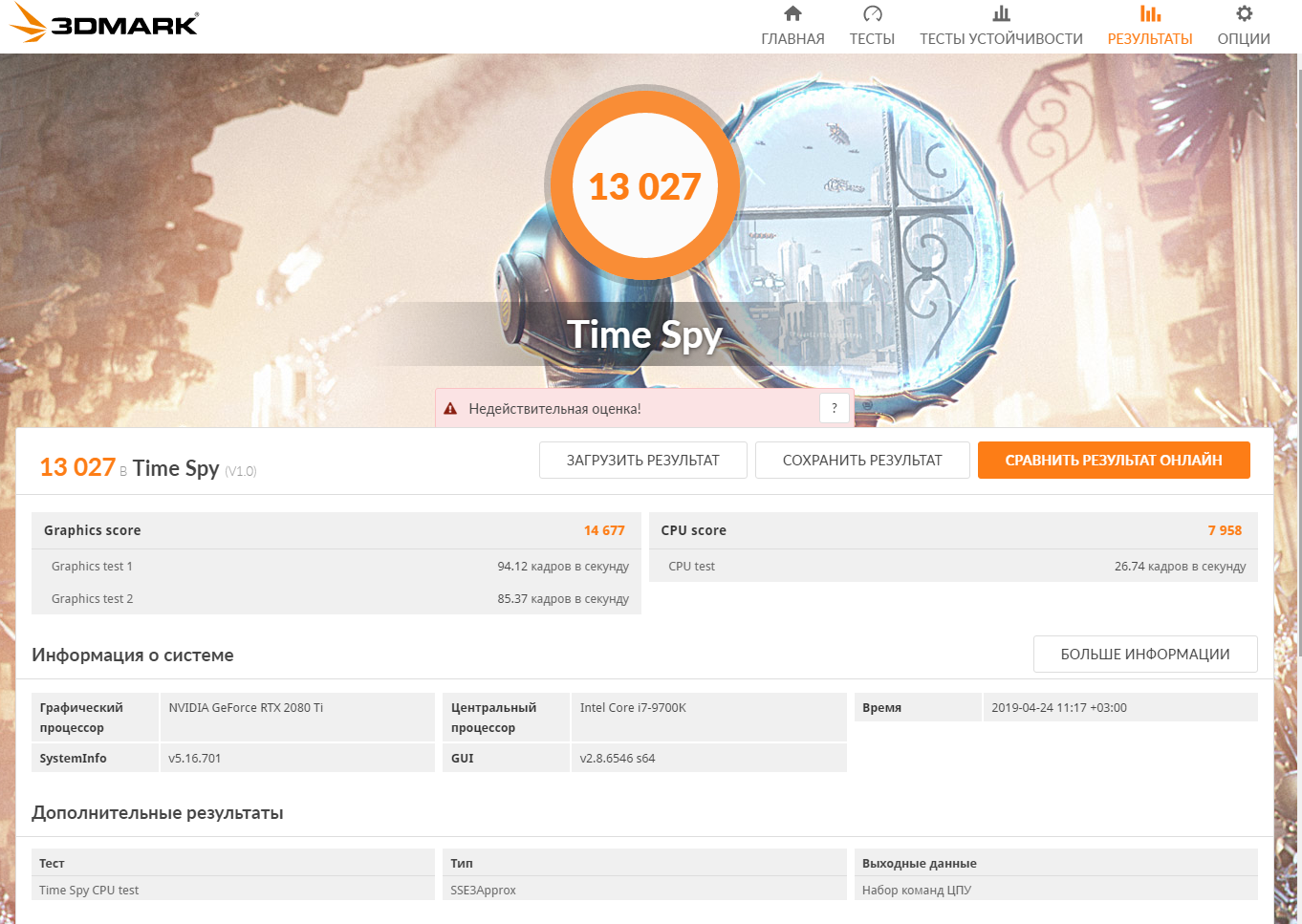 Да вроде совсем не вроде как, у меня 2080+8700к, у вас 2080Ти+9700к. Потом 14677 по графике это несколько печально, должно быть 15500 хотя бы с вашей то картой. Да и по процессору как то не очень, ваши честные 8 ядер проигрывают моим 12 виртуальным, хотя может так и должно быть.