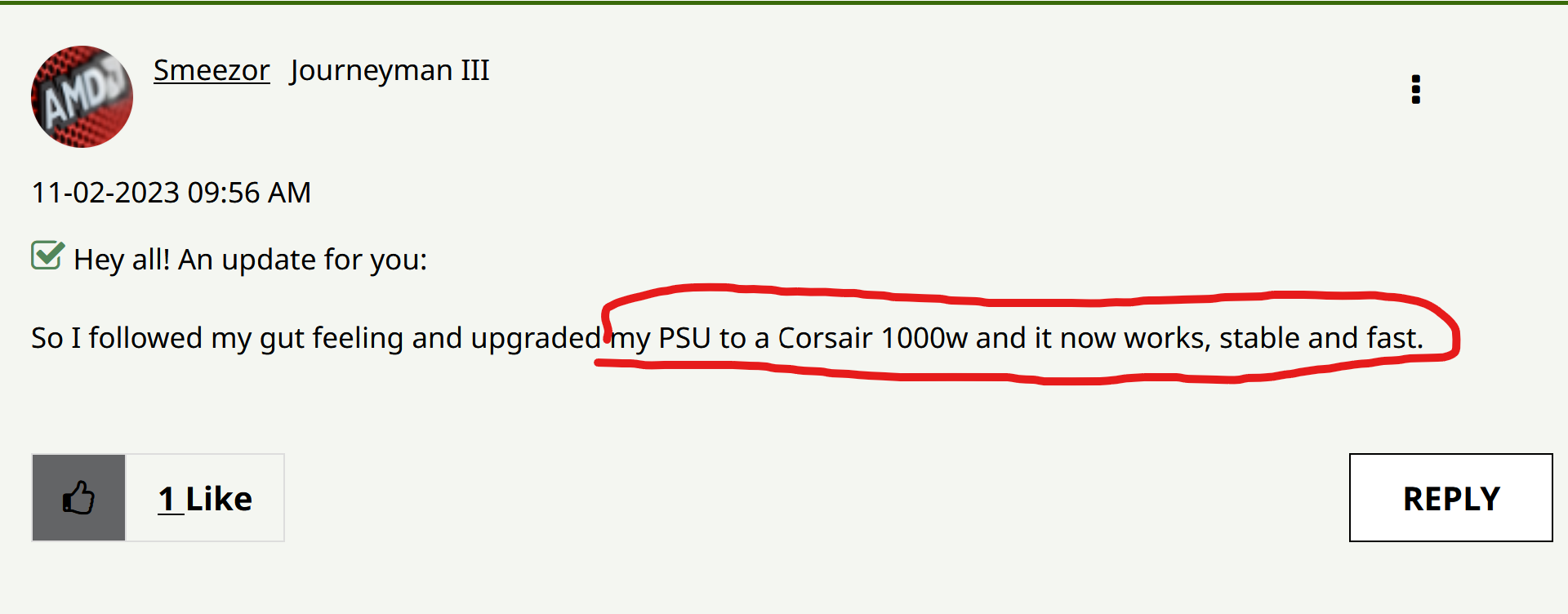 Подними глаза выше. Люди сидят на 750W блоках, когда по калькулятору поребление выше 750W и это без разгона. А они еще разгонять пытаются. Там БП нужен от 900W. Думаешь на реддите мало таких? Там куча сообщений, что после замены БП всё ок, почитай. https://www.reddit.com/r/AMDHelp/commen ... ck_screen/