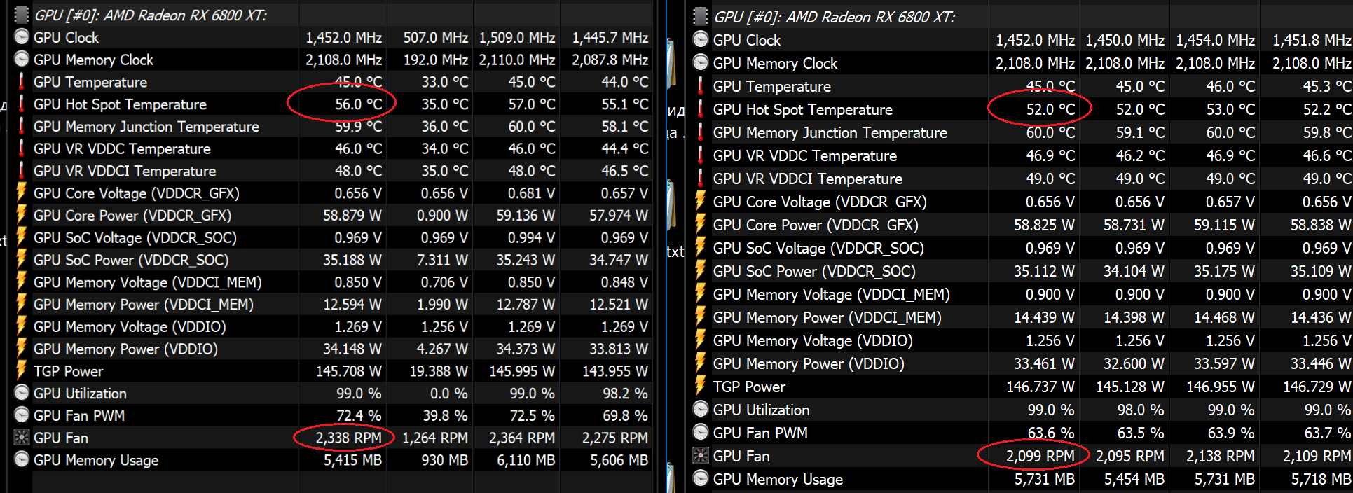 подтверждаю проблему с термопастой у powercolor rx6800xt red devil. По температурам было в пределах нормы (в играх ядро ниже 60 градусов, хотспот горячее на 11 градусов). После смены пасты на ноктуа2 ушли фризы в играх, снизилась температура ядра и хотспот +7 теперь. На скриншоте было слева, стало справа.