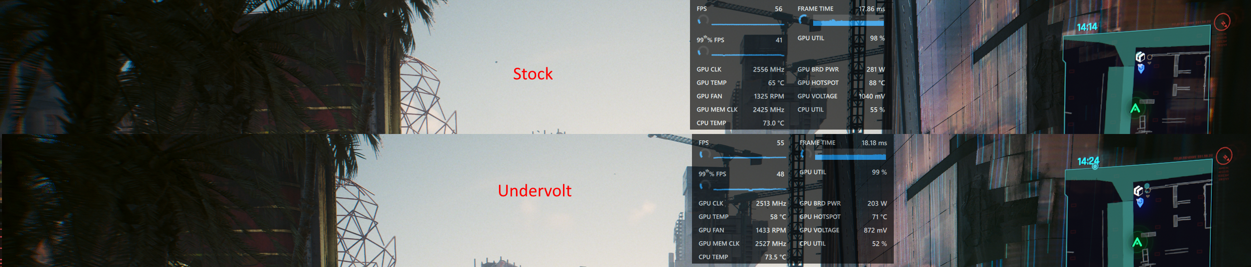 Приветствую. Проверил у себя в КП2077. Если карта в полном стоке то получаю те же 88 градусов по htsp. Для себя сделал андревольт: угомонил частоты, powerlimit -7 и ускорил вертушки. Получил: -17градусов по htsp и -1 fps при полном комфорте.