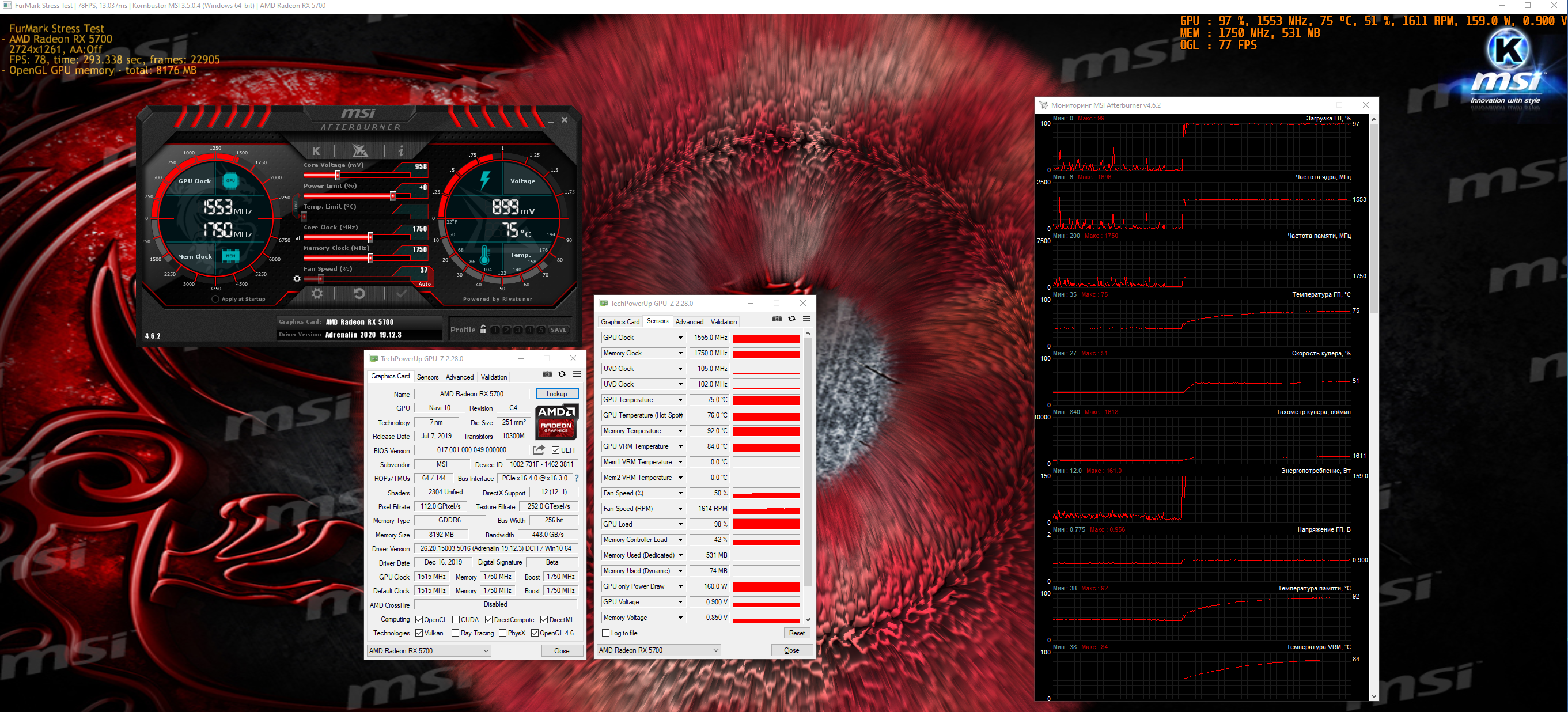 - Установить последнюю версию Windows 10 1903/1909. Как это сделать можно прочитать здесь https://www.microsoft.com/ru-ru/softwar ... /windows10. - Осуществить подключение питания карты рекомендуется двумя отдельными кабелями во избежание возможных проблем с блоком питания, с самими кабелями и пиковым потреблением. - Использовать блок питания рекомендуемой производителем карты мощности. - Необходимо учитывать, что некоторые запущенные программы по мониторингу (afterburner, gpu-z и подобные) могут вызывать различного рода проблемы в работе карты и поведения карты в игре (статтеры, снижение fps, сбой в работе вентиляторов). В некоторых случаях были проблемы c оверлеем Adrenaline. (данная рекомендация может считаться устаревшей, в случае использования последних версий драйверов и обновлений Windows) - Разгон оперативной памяти может вызывать статтеры, вылеты или черные/синие экраны, если он был произведен без должного тестирования памяти на стабильность. Поэтому перед проверкой карты и ее разгонного потенциала рекомендуется сбросить разгон процессора и памяти (пример, ещё пример, ещё пример и ещё). - Порядок установки новой карты: установить новую ОС -> установить драйвера чипсета -> установить прочие драйвера -> установить драйвер видеокарты - Рекомендуется переустанавливать драйвер после переключения БИОСа на видеокарте, чтобы он (драйвер) корректно интерпретировал новые настройки (эта рекомендация Sapphire, написанная на бумажке, которая вложена в коробку с видеокартой). - Рекомендуется заполнить табличку OC potential of RX 5000 series - Проверить карту стресс тестами и играми (в том числе при при разгоне) в стоке со сбросом любого разгона (в т.ч. памяти и процессора): 3DMark Time Spy, тест на стабильность, 20 прогонов - Одна из рекомендаций по отлову черных экранов и проверки системы на стабильность: LinX (задачи 40000) + Kombustor (1080р), вместе включаем и смотрим приблизительно полтора часа. Предварительно выкрутить вентиляторы карты и системы на максимум во избежание перегрева.