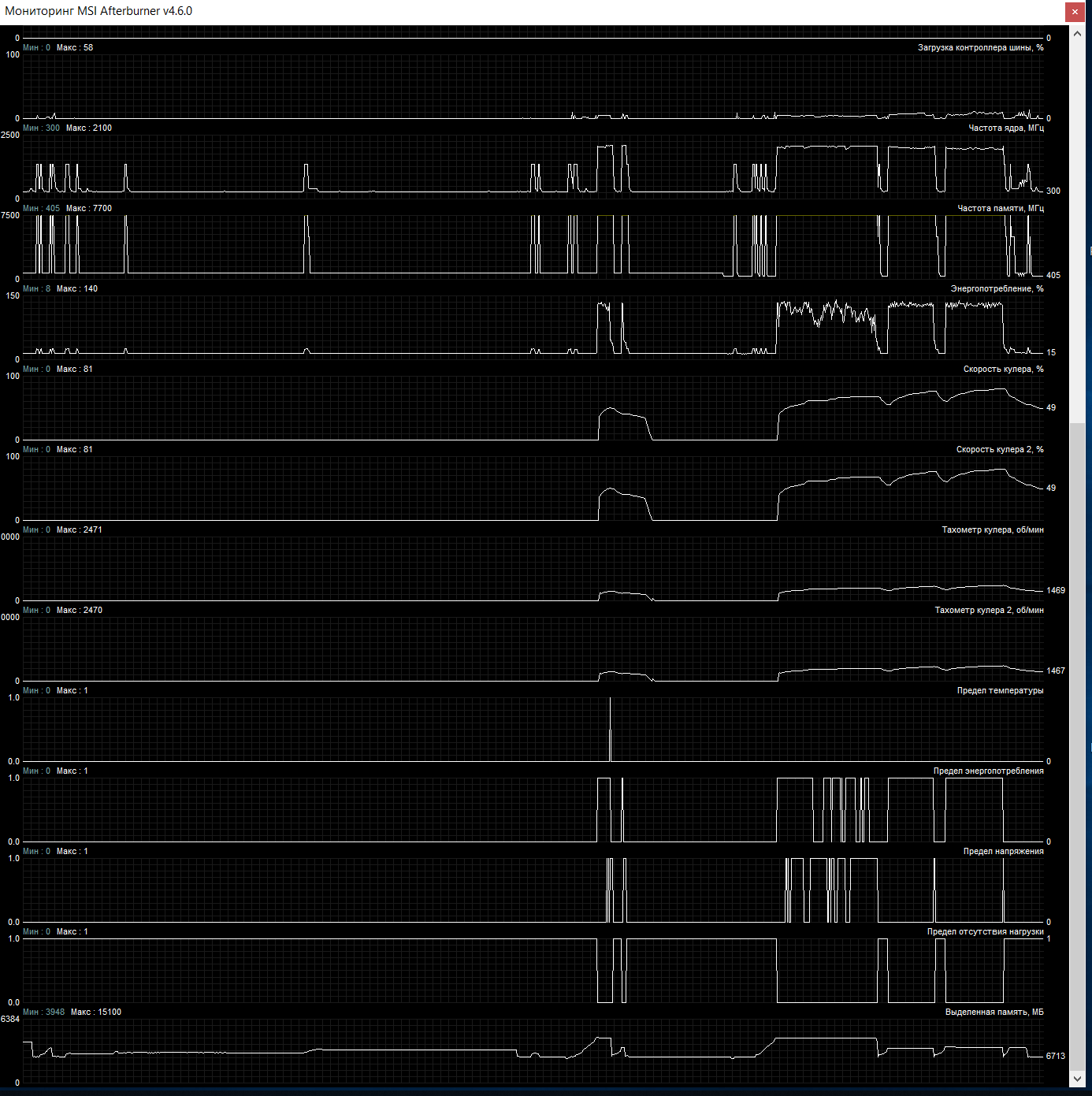 Память да, ядро нет. Неужели сам не видишь? И хотя ты не выставил маркер на частоте в графике, 2100 - это был кратковременный пик. Частота по графику падает, карта постоянно "долбится" в поверлимит. Это из того, что видно. Хорошо, если к концу теста 1900 осталось.