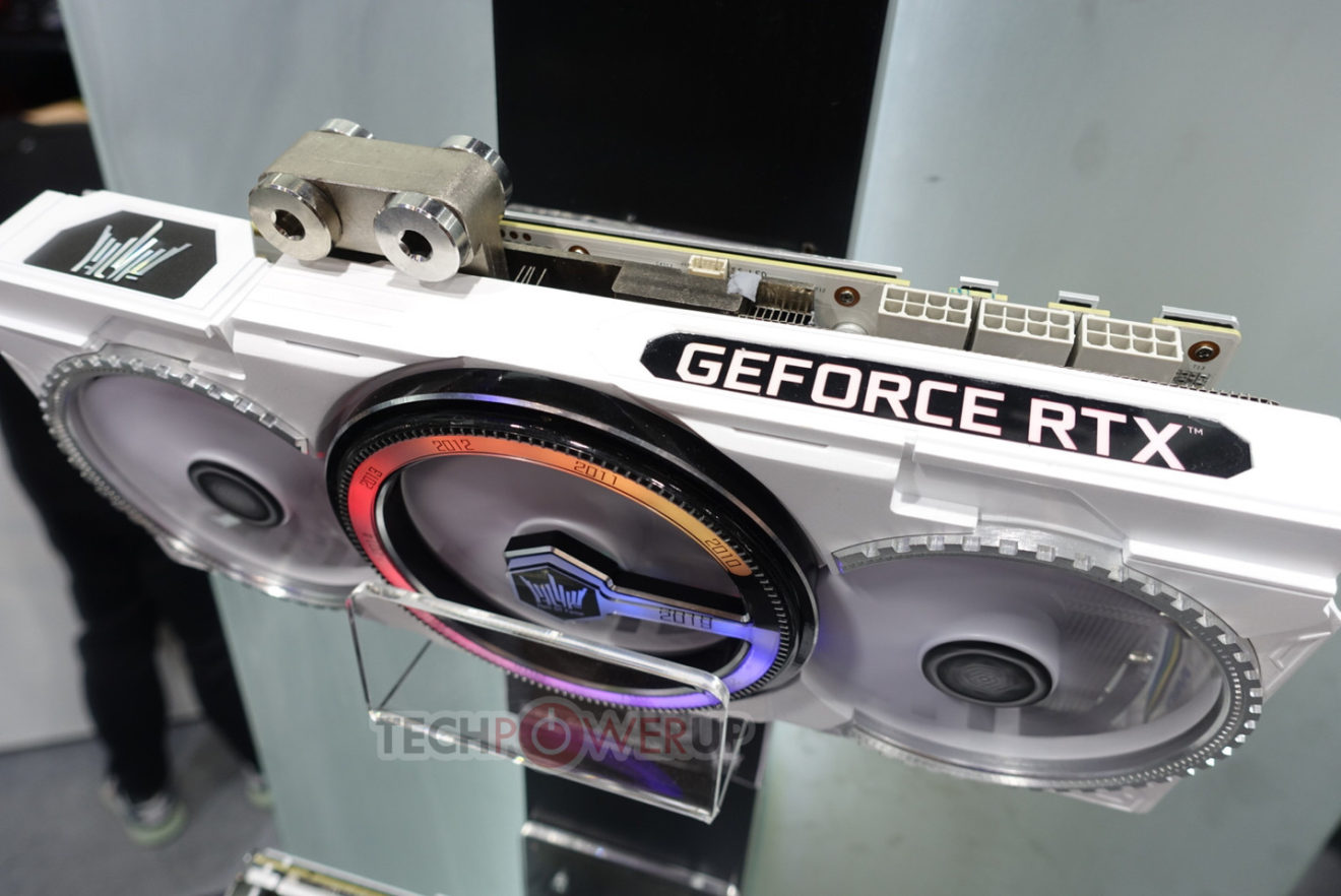 Компания GALAX в ходе выставки COMPUTEX 2019 продемонстрировала свою новую видеокарту, посвященную 10-летнему юбилею видеокарт семейства HoF. Новинка получила обозначение GeForce RTX 2080 Ti HOF 10th Anniversary Edition, и отличается фирменным белым дизайном печатной платы и системы охлаждения. Вокруг центрального вентилятора разместилась красивая RGB подсветка, позволяющая определить на какой частоте работает GPU в настоящий момент времени. Из других особенностей видеокарты GeForce RTX 2080 Ti HOF 10th Anniversary Edition можно отметить наличие сразу трех 8-контактных разъемов дополнительного питания. О других характеристиках пока ничего не известно, но скорее всего, частоты будут очень высокими.