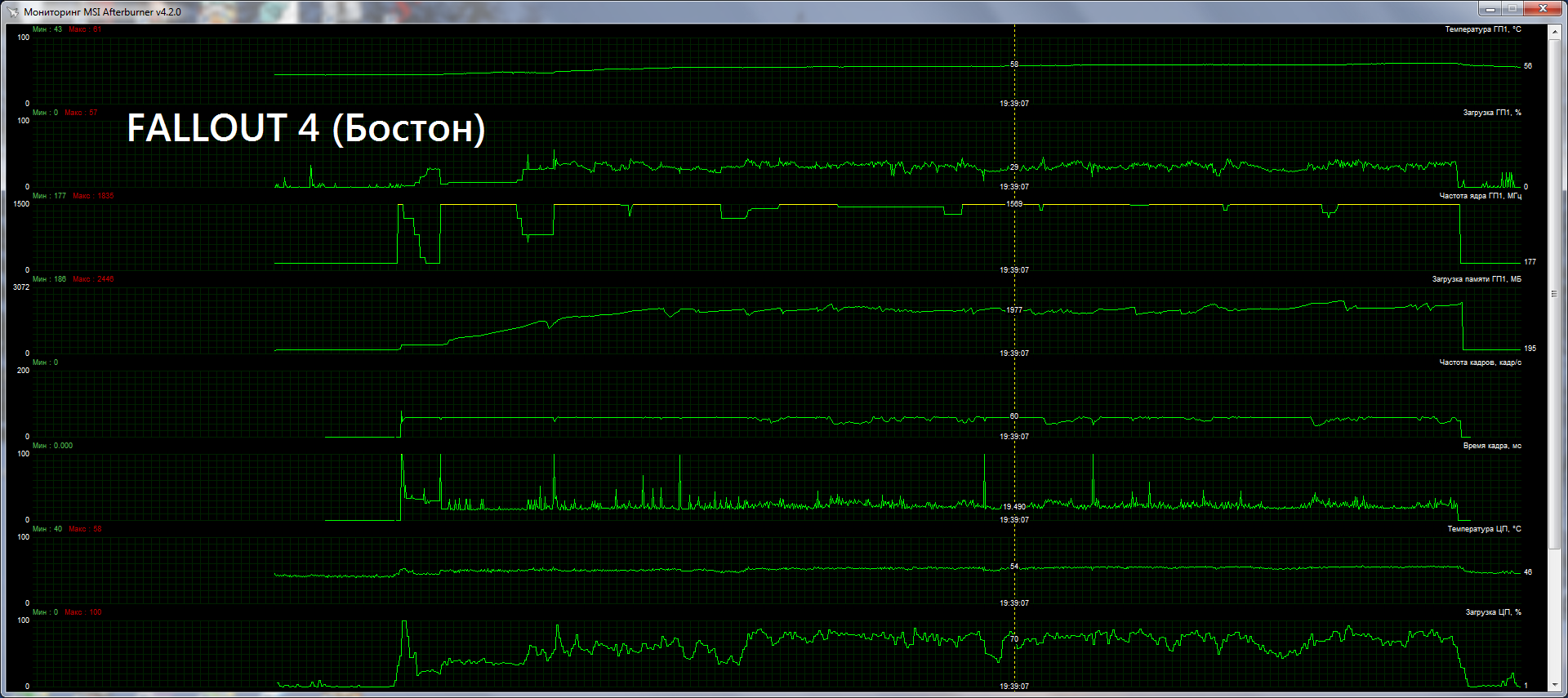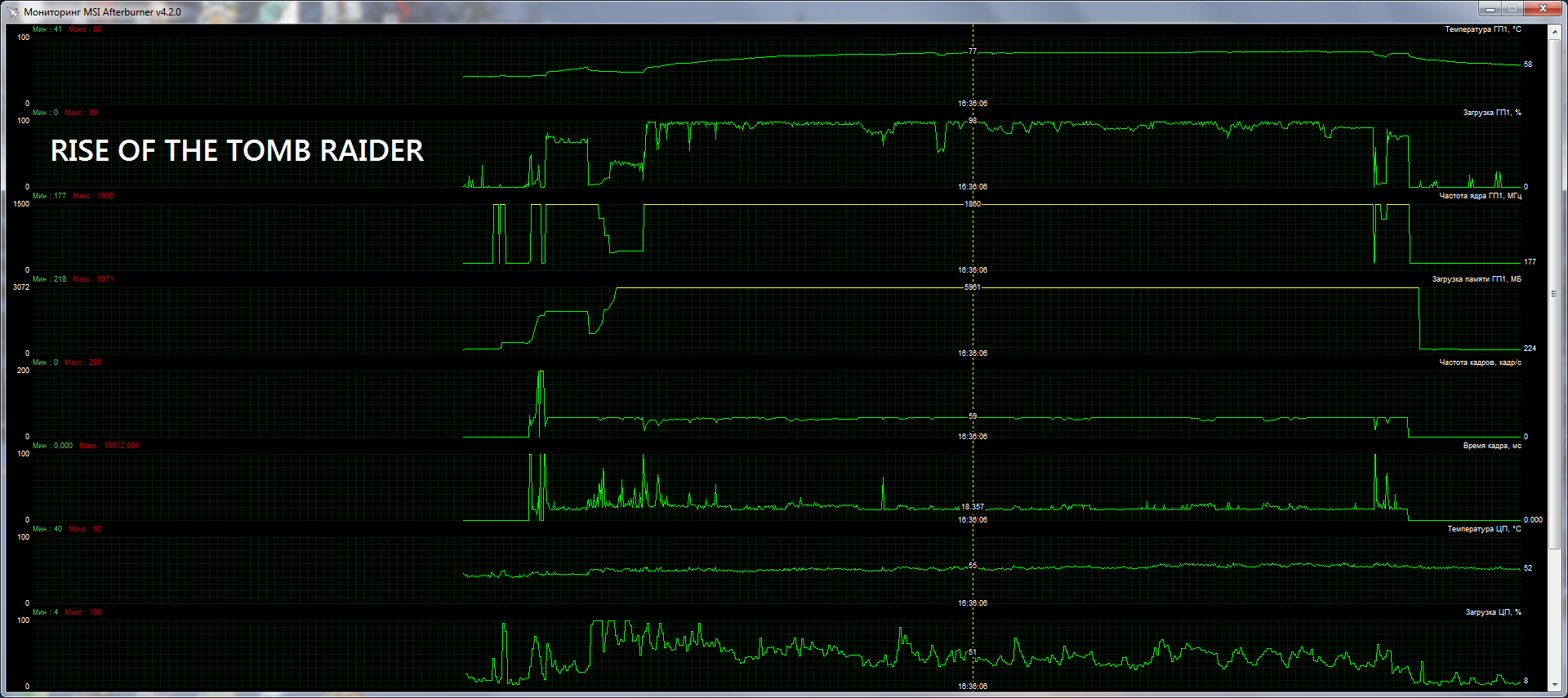 Посмотрел загрузку ГП, линия скачет как бешеная, от 35 до 98%, в среднем грузит карту чуть больше 50%. Частота не прыгает, стабильно держится на 2000.