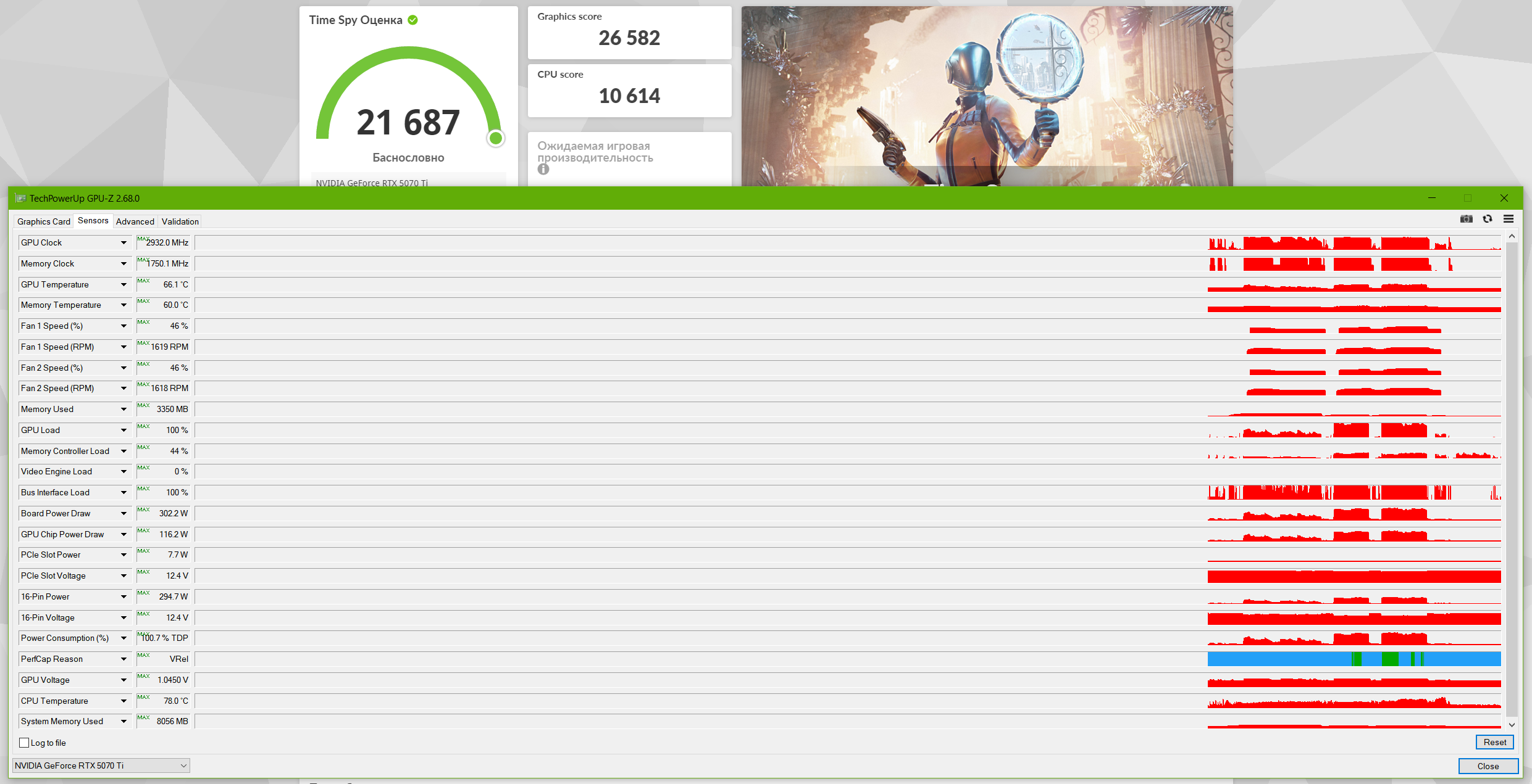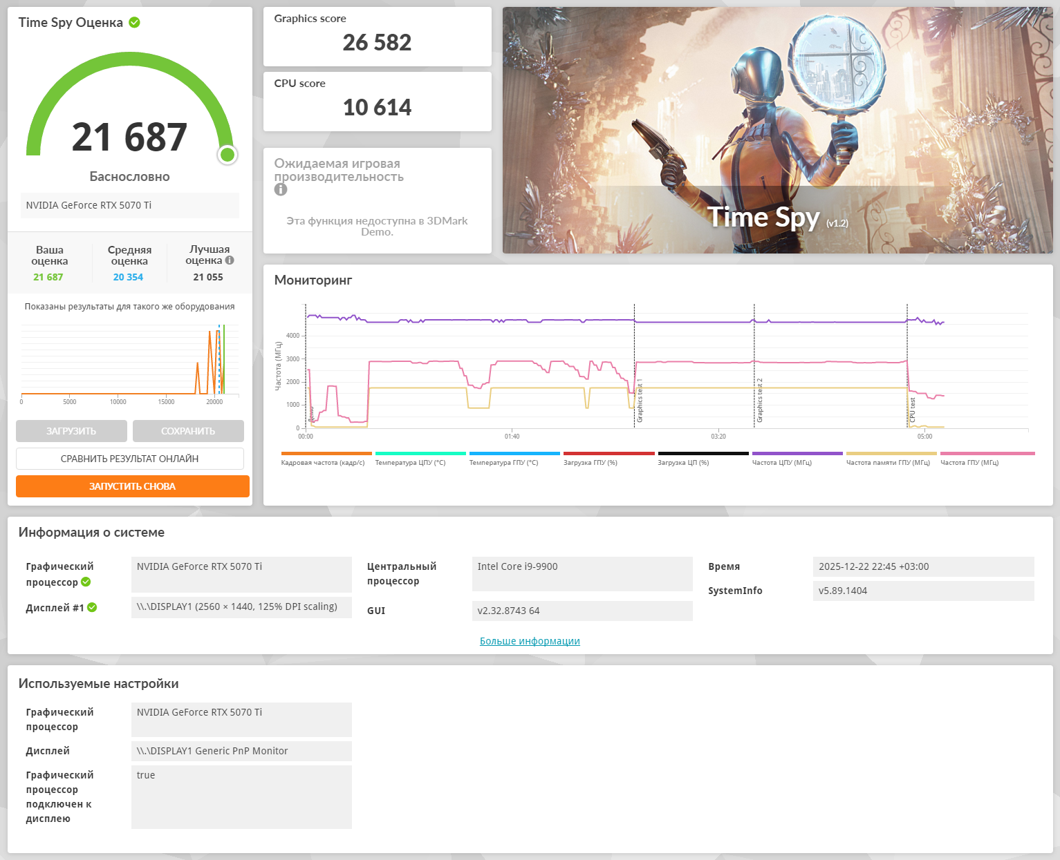Установил новый драйвер с нуля после DDU. Всё в 1440p. 1. Прогнал Superposition. Для 2060 и Квадры RTX 4000 (сильно присаженная 2070 8GB) - это нагрузка. Для 5070Ti - всего 60% утилизации чипа на этих же настройках. 2. GTA Online Enchanced на ультрах упёрлась в 9900 не-K (просадки до 55 fps бывали). Разгон памяти тоже снят - DDR4-3200. 3. Вот 3DMark TimeSpy пропёк немножк карту (302W PD). Но и там она бустила 2860-2932Мгц, что прям удивляет. Прям HOF v2.0.