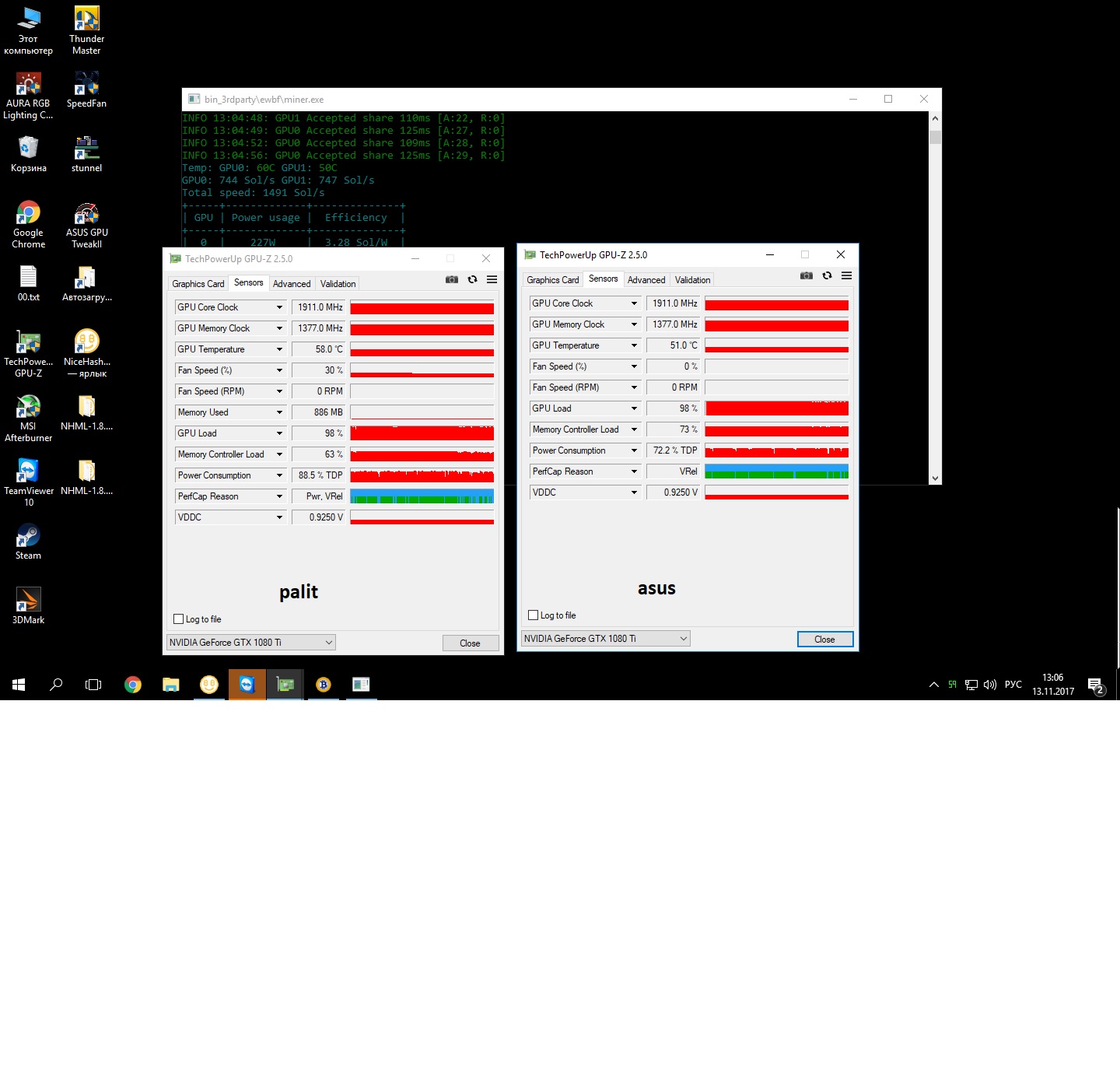 Nic101, холод - понятие относительное. На ферме стоят две карты, Palit 1080 ti и asus strix 1080Ti, у палит температура 60 градусов, но равномерная, тыкал пирометром во все щели, самая горячая точка - сзади чипа, там тоже в районе 61 показывает. Смотрим асус, на чипе по мониторингу показывает 52 градуса, но тыкаем пирометром в пластину, и вуаля, доходит до 62 градусов. Т.е. у палита температура более равномерна по карте, а у стрикса GPU охлаждается прилично лучше, а память - чуть похуже, чем у палита. Обе карты охлаждаются 12см вертушками на ~1000 об/мин