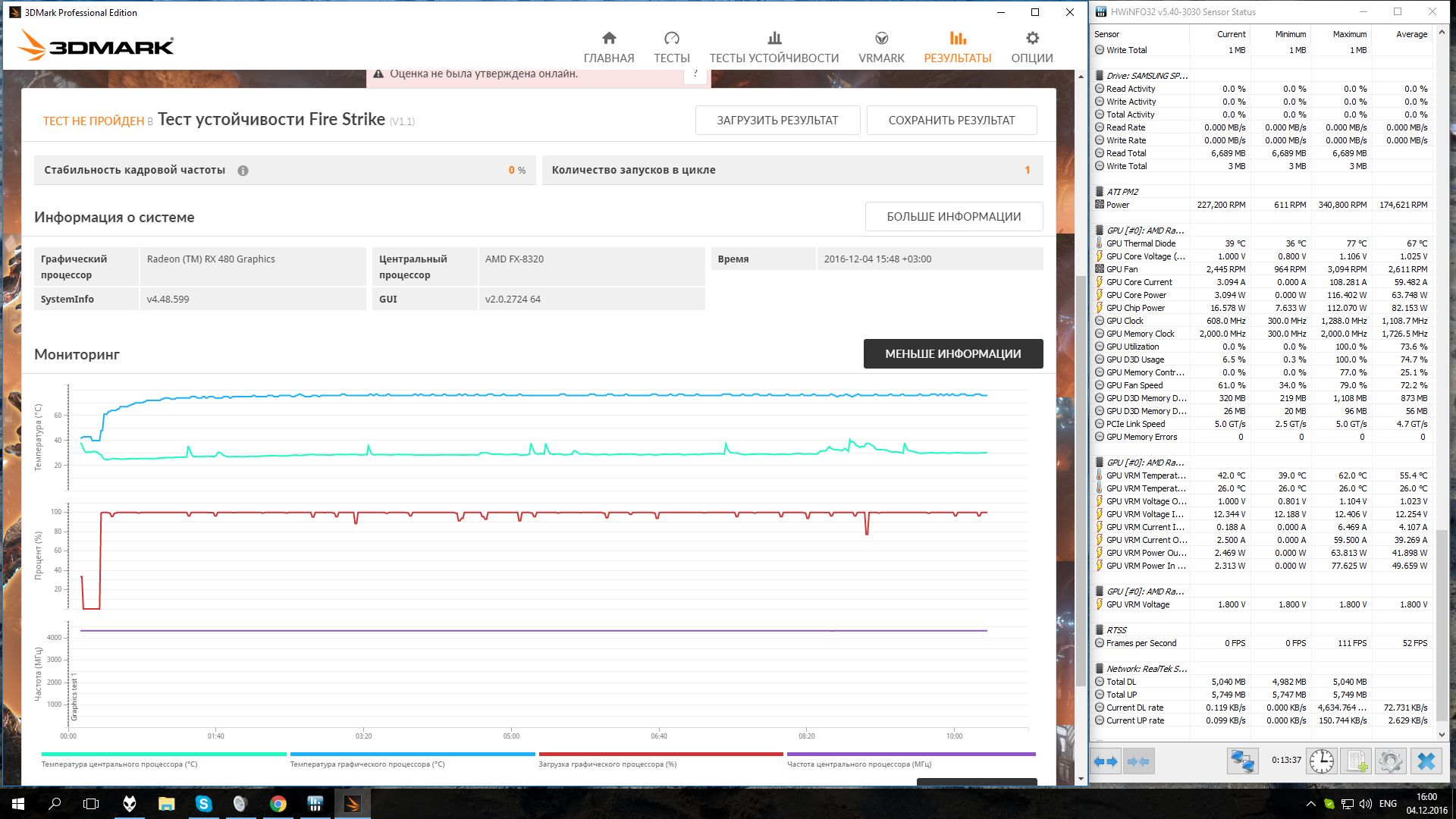 Признаться честно, запустил тест в оконном режиме и время от времени альттабался в браузер, скайп. Нагрузка в это время с видеокарты не спадала. Ну ничего, это первый прогон 20ки, все еще впереди
