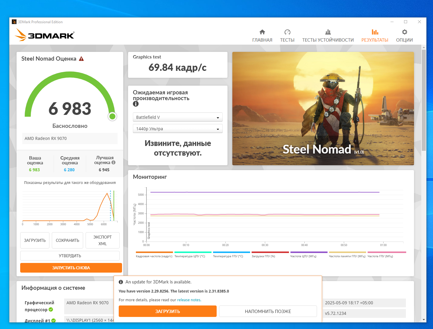 Прогнал стил номад на своей 9070хт, в общем без настроек он запускается в 4к и выдало 7352 балла, в родном 1440п там баллов по более, зачем мне тест в 4к когда у меня 1440п моник, гении конечно работают в 3д марк . -50 по гпу держит но карта долбится в 340 ватт и частота от 2950-3000 плавает в тесте, так то так в общем, в стоке не тестил.