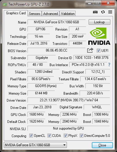 Q:Поддерживает ли карта аппаратное декодирование HEVC(H265)? A: Да, видеокарты на базе GP106 Pascal аппаратно поддерживают декодирование HEVC(H265).