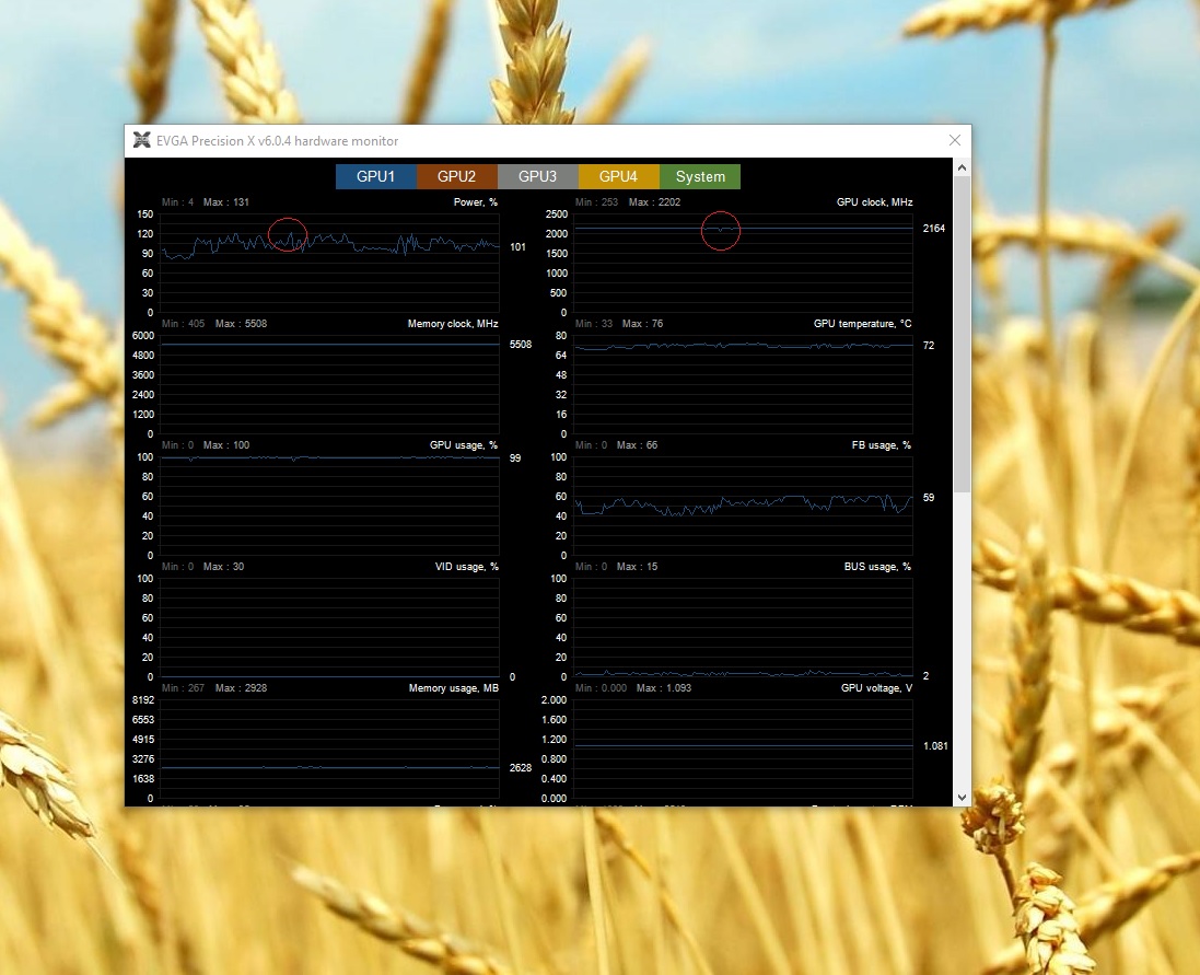 Хм, немного поспешил. Вот с тем что паскаль живет своей жизнью ты прав) Дело в том, что я весь вечер отыграл с таким напряжением (1.093), сейчас запустил - а оно стартануло с 1.081. Тоесть с этого напряжения оно стартануло на холодную, её и удерживало. Прикрепляю скриншот, 10 минут игры в Battlefield 4, можно видеть ровную прямую напряжения, и устаканившуюся частоту. Так же виден троттлинг по приближению к паверлимиту - в одном месте он превысил 120% при 130 заданных.