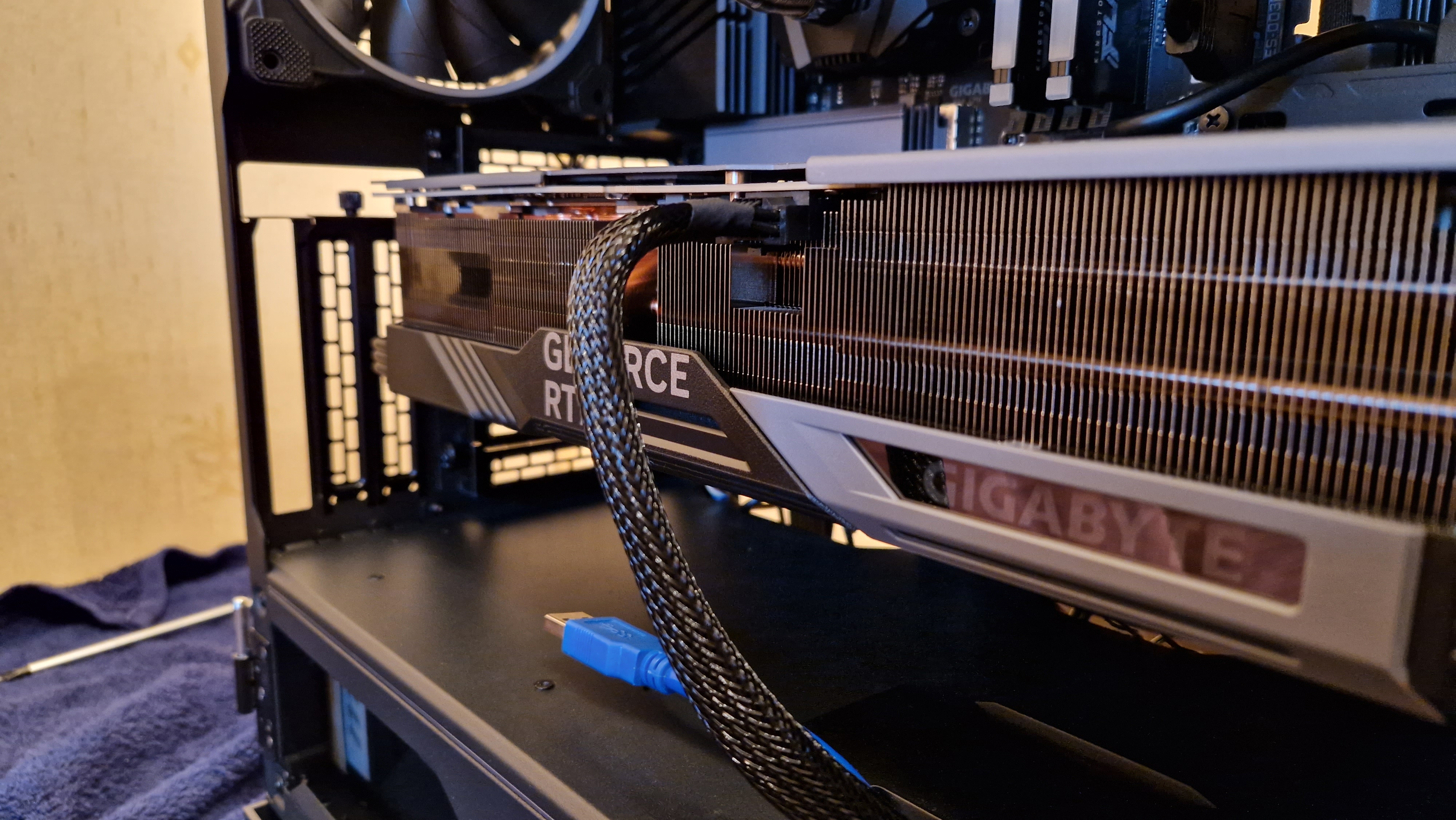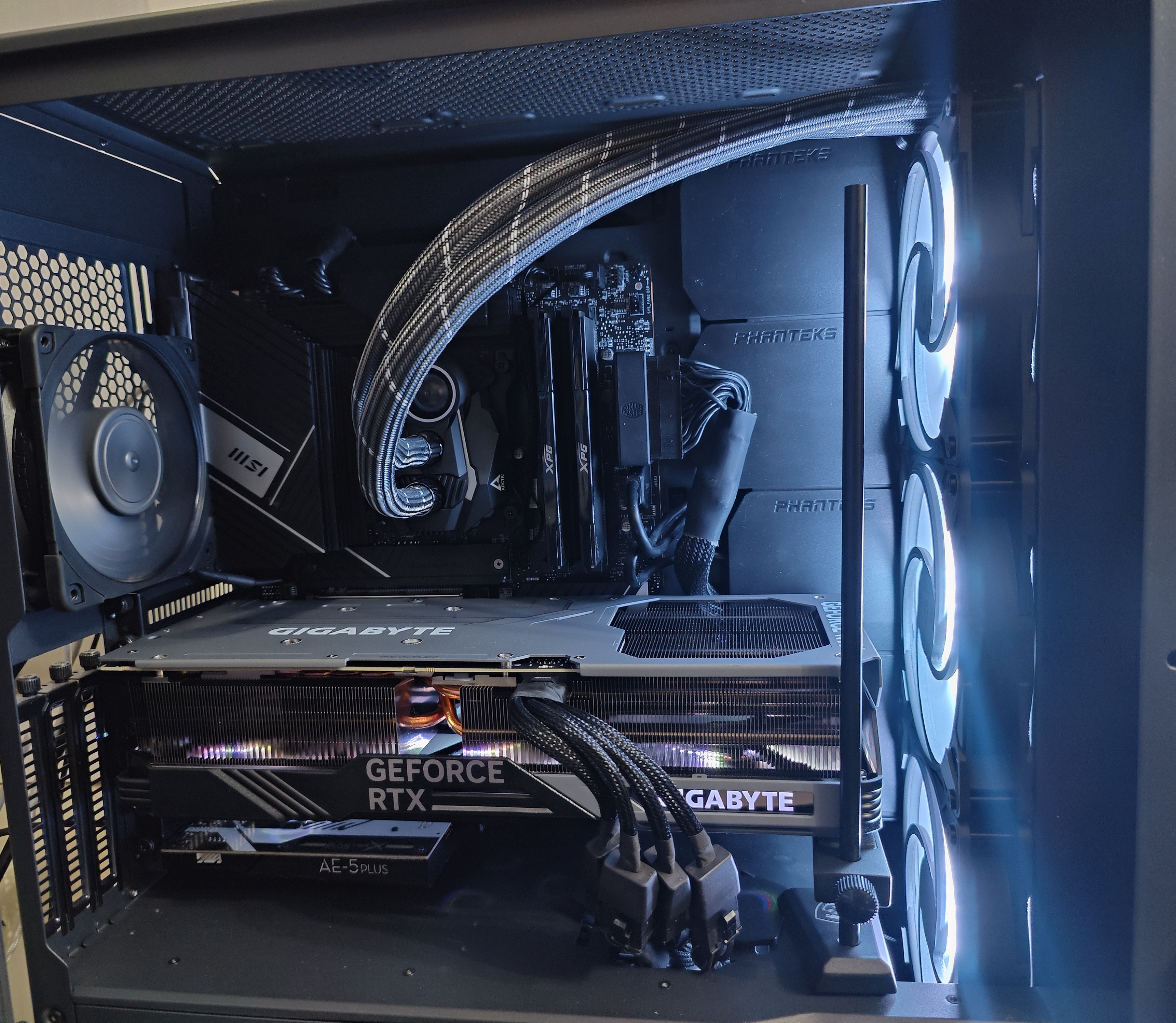 в общем прикупил себе месяц назад 4090 гейминг ос. поставил, еле влезла, см 2 осталось до радиатора. самая шумная вещь в системе. обороты постоянно 1950-2100. темпы 65-72. андервольт практически не помогает. включенный и напрямую направленный на карту на расстоянии 10 см вентилятор комнатный не помогает (просто было интересно). сильно раздражает это ввввууууууу - вжвжжжвжвжвжв. радик спереди, потому что наверх не уместится и будет жрать весь кипяток с карты. стекло корпуса, сам корпус люто нагреваются. воздух выходит прямо очень очень тёплый. какие нибудь идеи мб? упд. забыл, что фото было сделано как только поставил карту. наверху 3 вертушки ноктуа а12х25 и сзади тоже. все на выдув.