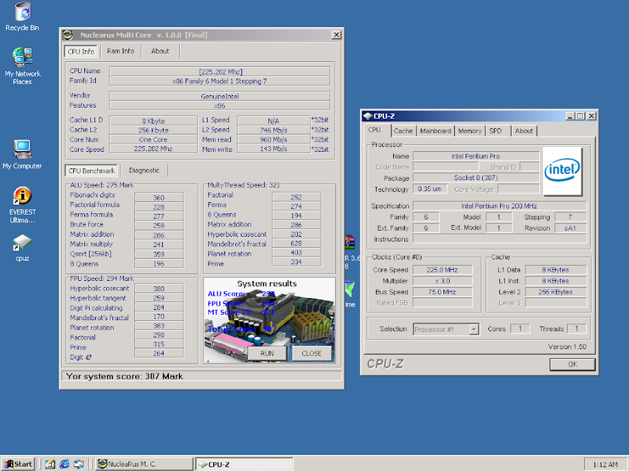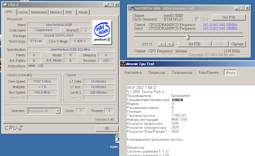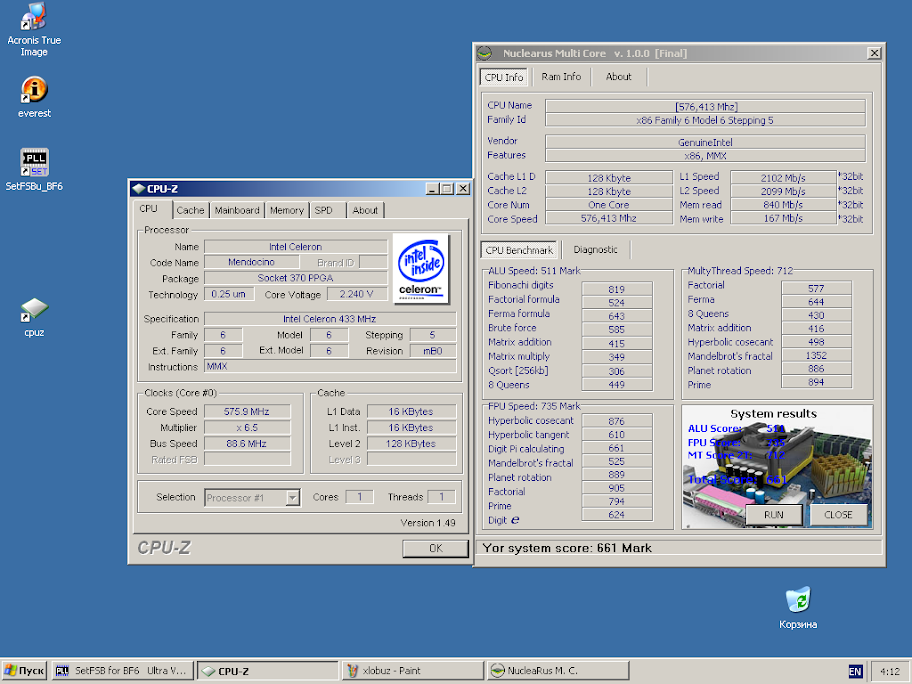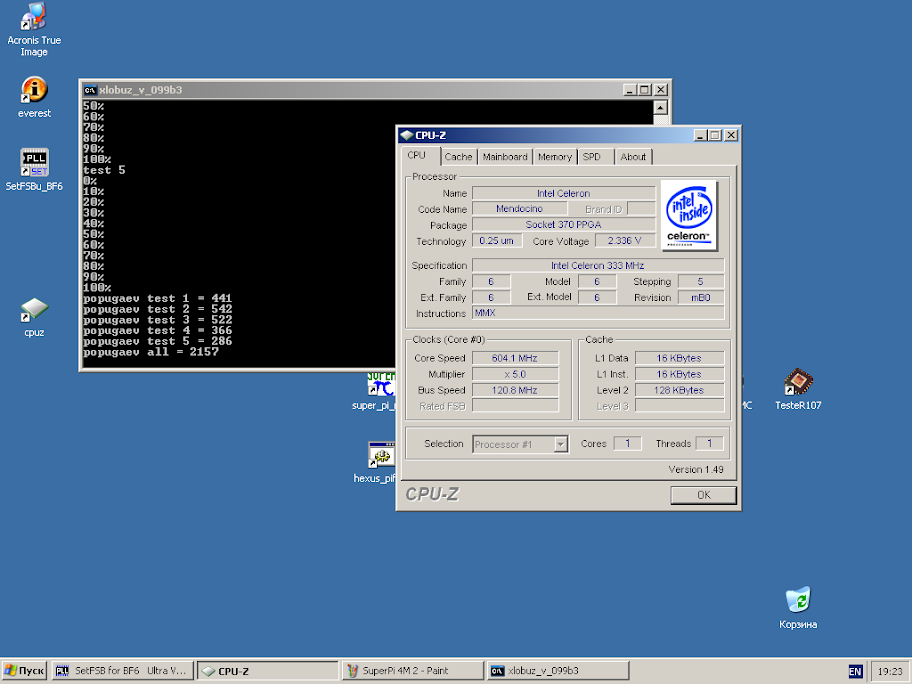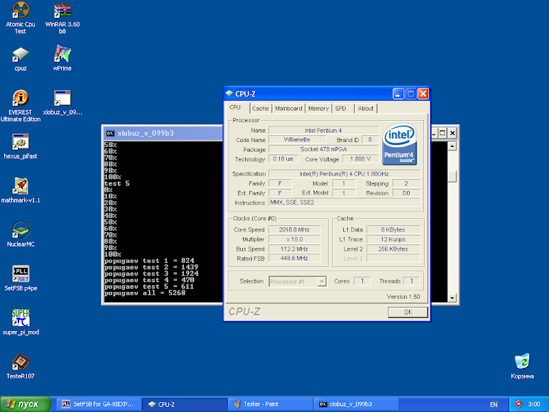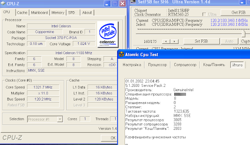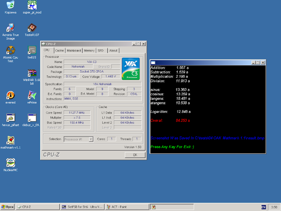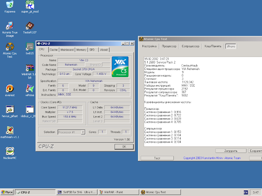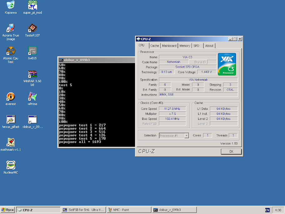 1. ------------------------------------------------------------ CPU: VIA C3 (0x673: Samuel 2) 133x6=800MHz, Ucc=1.7V MoBo: Chaintech 6VIA4 (VIA Apollo Pro133A) RAM: 256Mb PC133@133-3-3-3-9 (Samsung) HDD: IBM DTLA307015 (15 Gb) PSU: Powerman FSP250-60GV OS: BartPe из MS Windows XP Pro SP2