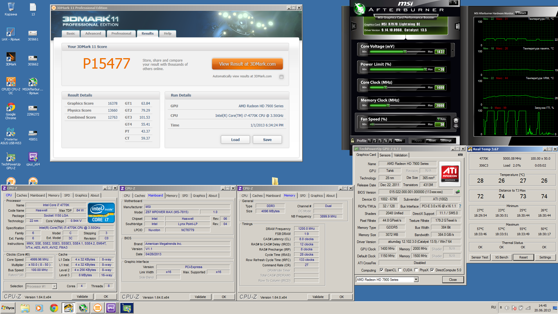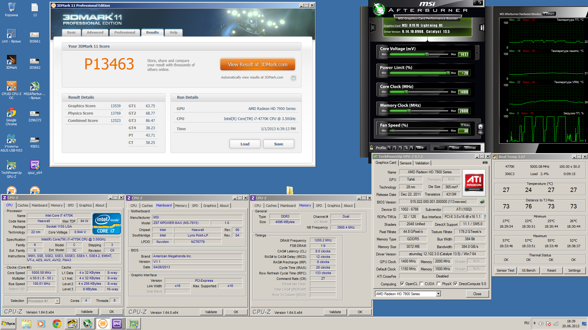 I7-4770K@5000MHz MSI MPower MAX Corsair Dominator 2x2gb 2400 8-12-8-28 1.7 MSI HD7970 Ligtning BE @1400\2000 Tesselation ON #77 #77 память походу глючила. в экстриме мало.