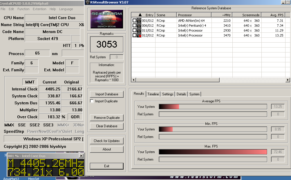 Тест глюкавый какой то , понял почему так мало показало у тебя . Если клокгеном разгонять то он игнорирует (!!) и берет частоты из биоса И причем все остальные тесты бенчатся нормально , тоесть берут частоты заданные клокгеном ... кроме Real Storm Benchmark 2006 По крайней мере на моей конфе это так , и видимо и на твоей тоже Пришлось гнать из биоса напрямую
