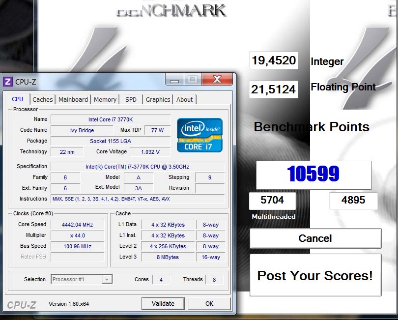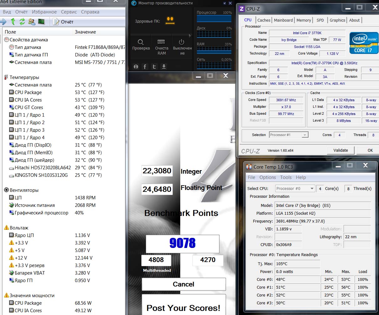 Aппаратка в профиле,охлаждение воздушное. Здесь в лидерах у кого ядер больше,от частоты памяти зависимость меньше.Для запуска теста(W8) необходим Net.Framework 2 или3(входят в 3.51) по умолчанию ось без него. Платформы 1366\1155 при похожих частотах проца и памяти: #77#77 Это не LinX 0.6.4 AVX,проц грузит средненько: #77 Проц в разгоне,а память нет: #77 Если запустить несколько копий,время увеличится - загрузка проца нет. В сумме 12000: #77 5.2GHz 1866MHz - 12313: #77 5.26GHz 1852MHz - 12508: #77 5259MHz 1852MHz-12500 ровная цифирка: #77