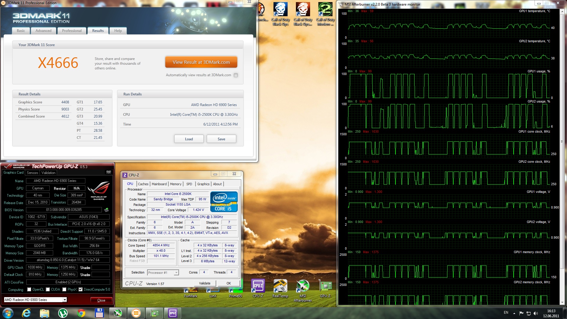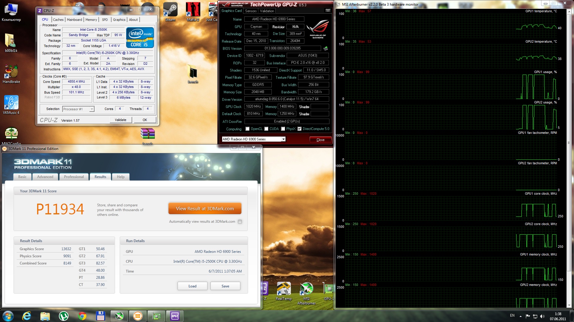 Процессор:..........................athlon2 x3 435@x4 3700 Память...............................KHX8500D2K2 4Gb DDR2 Видеокарта.........................GeForce GTX 470 1280Mb (v=1075. 875-1750-880) #77 Результат : Р4892 если рассмотреть внимательней, то graphic score осталься неизменнным в районе 6000, но физика выстрелила просто феерично : от 2800 и сразу к 3300 ( и это всего-лишь разлоченный атлон х2 435 - представте , что это даст i5-2500k) (в тесте физика фпс вырос с 8.5 до 10.5 кадров - на том же самом проце и частоте (уже и слайдшоу не так давит )