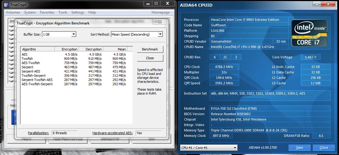 программа TrueCrypt ,имеющая встроенный бенчмарк ,показывает скорость шифрования данных по различным алгоритмам и их сочетаниям. Скачать можно ТУТ (3.3 MB . Windows 7/Vista/XP/2000) Нет необходимости в установке.Можно только распаковать в отдельную папку и запускать оттуда exe. файл. Buffer size предлагаю устанавливать на максимальное значение-1GB