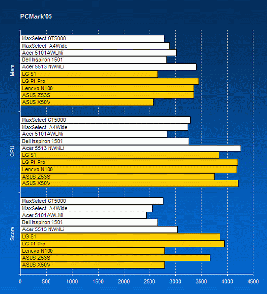А вот ASUS X50V в аутсайдерах. Судя по всему, производительность чипсета SiS671 не способна дотянуть до уровня Intel 945/965. Особенно это видно по тесту памяти.