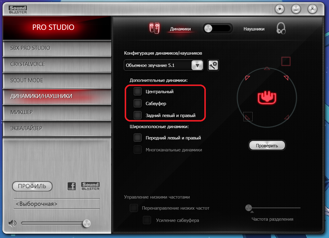 если у тебя акустика 2.0, то в панели SBX надо лишние выводы по-отключать, чтобы драйвер перенаправлял каналы, а не Винда. она должна 5.1 генерировать, а микшировать должен драйвер.