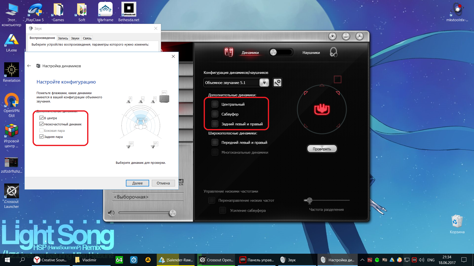 Упс. Нет. Сейчас перетестирую и сделаю ролики. Выложу на Ютуб. В Винде все динамики должны быть выбраны? А в панели SB только Левый и Правый? Я правильно понял?