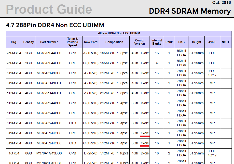 Samsung сегодня наконец-таки расшарила техническую документацию по 4Gb и 8Gb DDR4-микросхемам ревизии B-die и E-die и это при том, что на последних модули клепают с конца лета прошлого года. К сожалению, технической документации по новым C-die (10 нм) микросхемам в открытом доступе не оказалось. Очень жаль. "Низачот" Самсунгу!