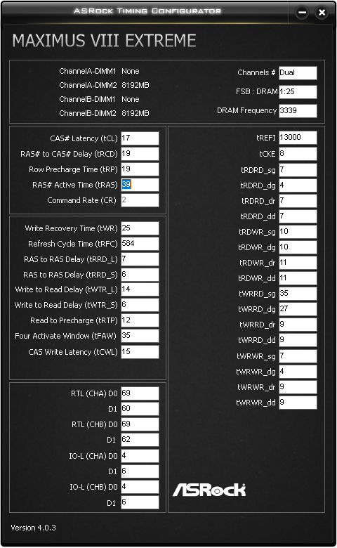 Victor91rus, помоги пожалуйста с настройкой вторичных-третичных таймингов. Имеется комплект 2х8Gb Kingston на чипах Hynix. По профилю XMP работают на 3000MHz, тайминги 15-17-17-39-2t при 1.35V. Я немного разогнал до 3200MHz, тайминги ужал до 15-16-16-36-1t при 1.28V. В таком виде всё работает стабильно, все тесты проходит. Больше гнать не буду, так как контроллер памяти греет проц не слабо. Хотелось бы разобраться с настройкой вторичных-третичных таймингов. Читал, что правильная их настройка добавит 5-10% производительности в играх и т.д. Если не сложно, выложи пожалуйста таблицу из Asrock Timing Configurator для памяти 3200.