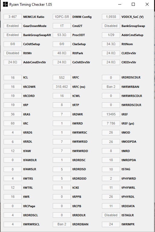 Здравствуйте. Помогите разогнать память. Дано: 2x G.Skill Trident Z RGB 8 ГБ 3600-18-22-22-42 XMP; мат. плата Asus Crosshair VI Hero; проц - R7 Pro 1700; чипы памяти Samsung (ну по крайней мере аида, тайфун и цпуз так показывают) Разогнал самостоятельно до частоты 3466 с таймингами - 16-19-19-36-60, напряжение 1.42 В, soc 1.1В, больше всего пугает латентность в тестах 74. Что пробовать, что уменьшать? Есть предложения? Пробовал калькулятором предложенные пресеты. Пресет для B-die ни в какую не хочет работать с предложенным tRFC (вообще не запускается), после чего выяснилось что минимальный tRFC без вылетов из винды 552, потом использовал частично пресеты Samsung OEM с Micron B-die, и уже с ними смог запуститься и пройти ТМ5 @1usmus_v3, но Extreme1@anta выдает ошибки.